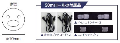 明るく元気な黄色のカット販売タイプ。1m単位で必要な長さだけ購入可能、φ10mmでモチーフ制作に最適。お求めやすい価格でIPX5防水。電源部・アクセサリーは別売りです。