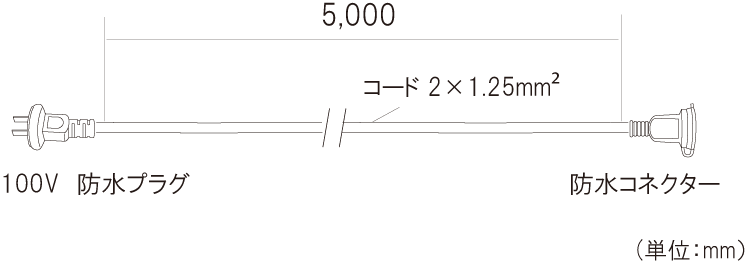 ベルトワイヤー用の電源延長コード。防水丸型プラグ採用で屋外も安心、500cmの長さで設置の自由度が高い。最大負荷容量500Wで複数ライトに対応します。