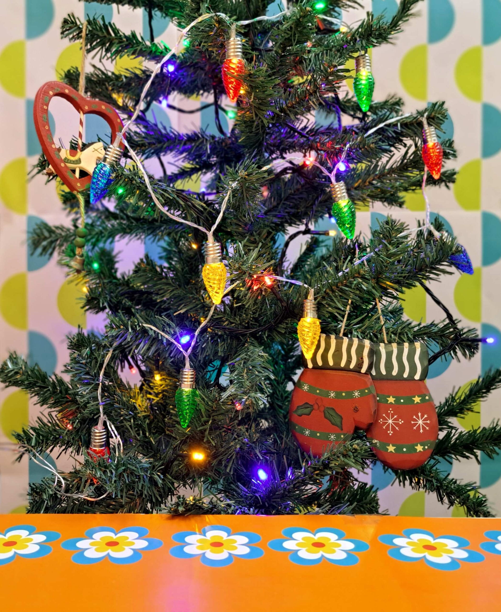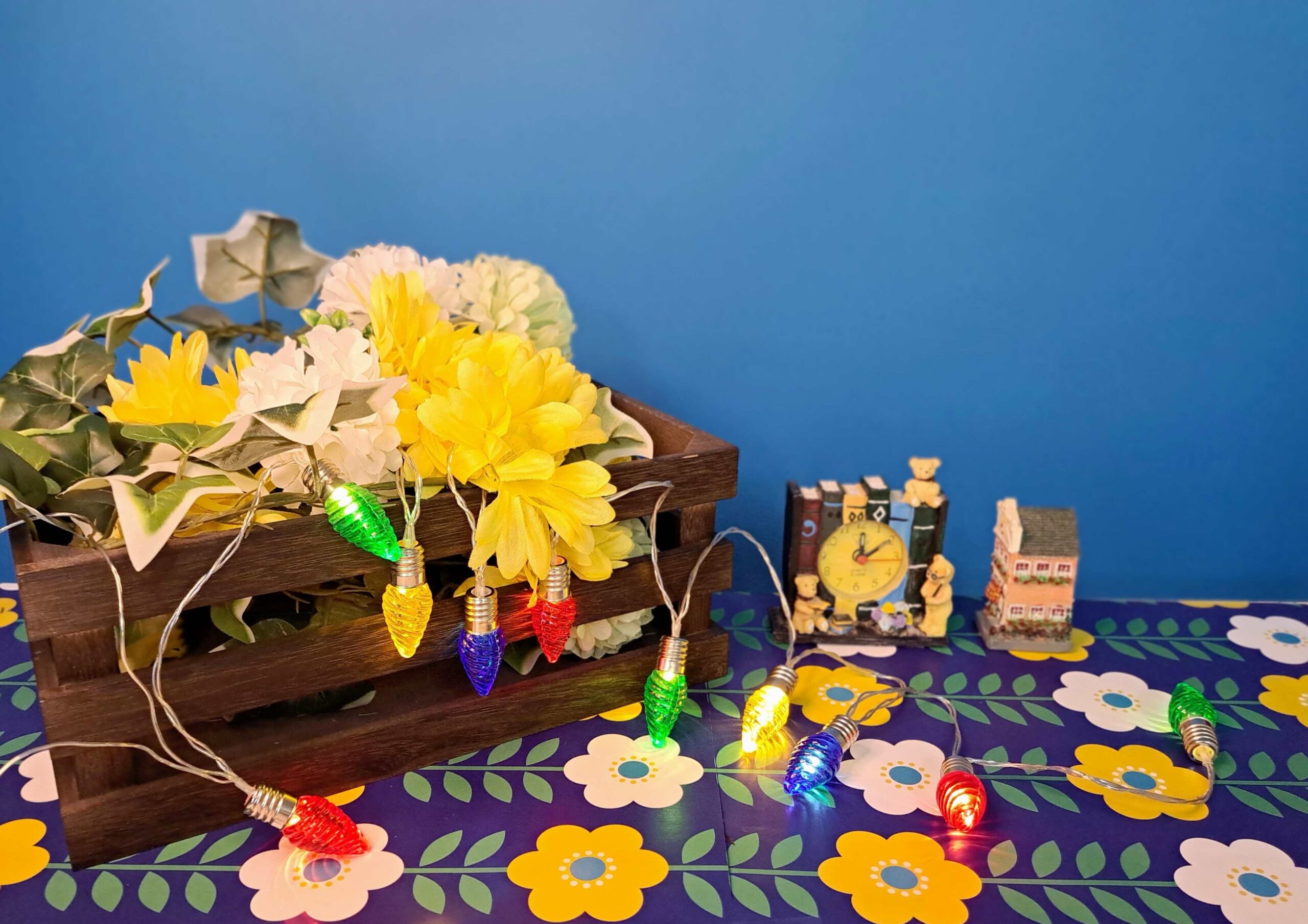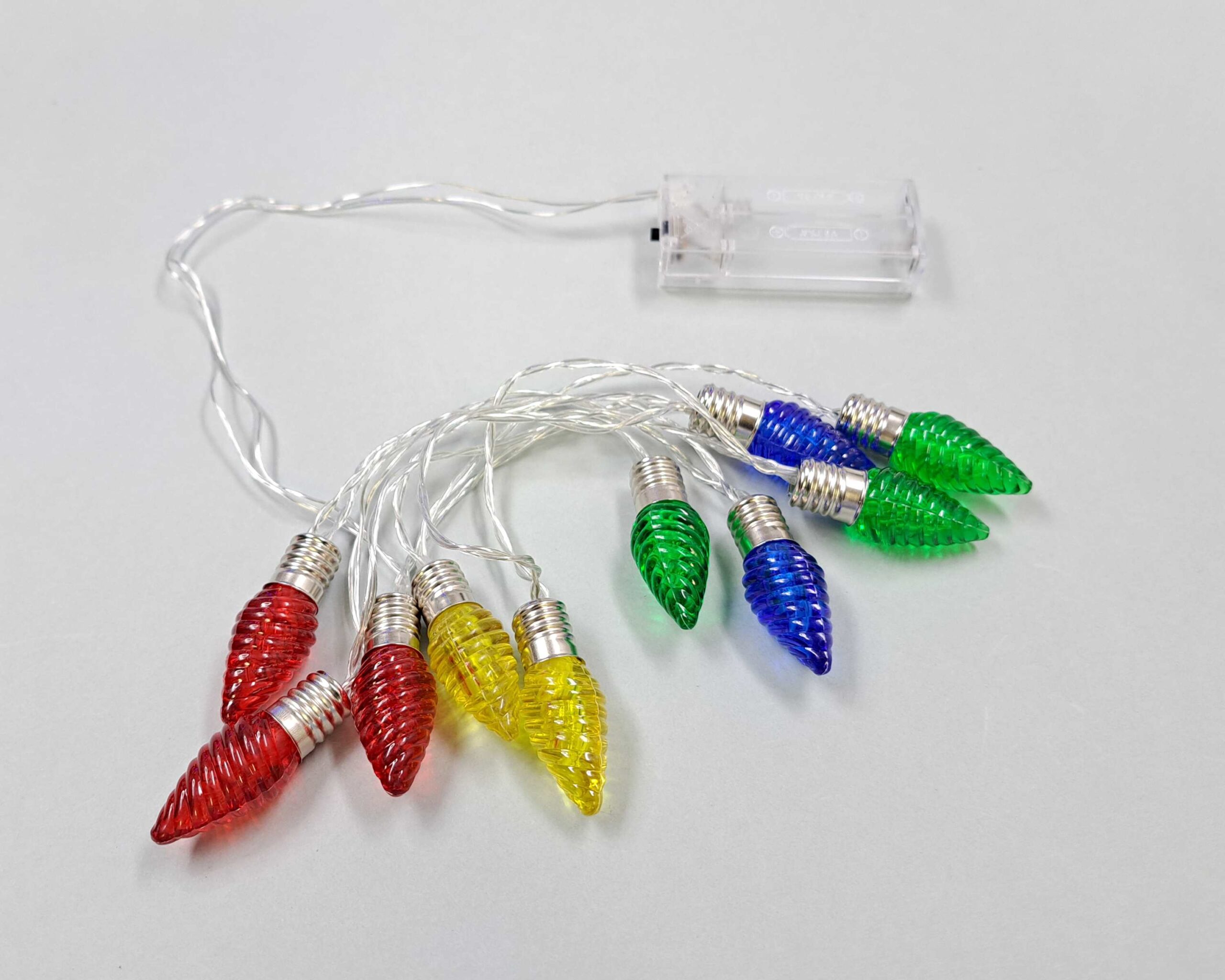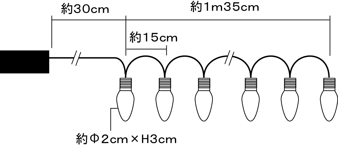 レトロポップなかわいいライトです。ライト部分約135cm、球間約15cm、キャップサイズ約直径2cm×高さ3cm。電球色LED10球搭載でキャップ4色(赤・緑・黄・青)。単三電池×2本(別売)使用。室内用で常点灯タイプ。PC素材で重量約100g。