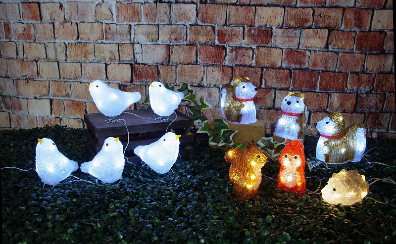 リス2匹とハリネズミ1匹のセット立体モチーフライトです。リス・ハリネズミ間約50cmで連なるデザイン。白色LED24球搭載で可愛らしい輝き。4.5Vアダプター付きで常点灯タイプ。IPX4防水規格対応。消費電力1W、重量約0.6kg。アクリル素材。