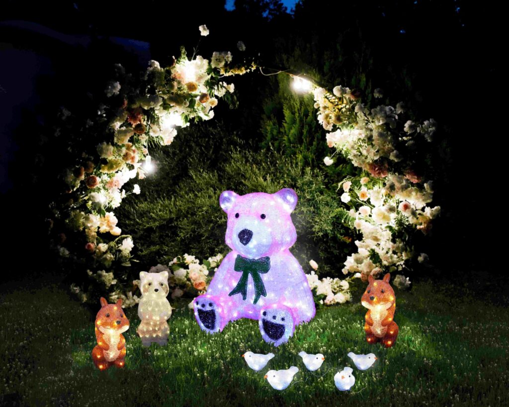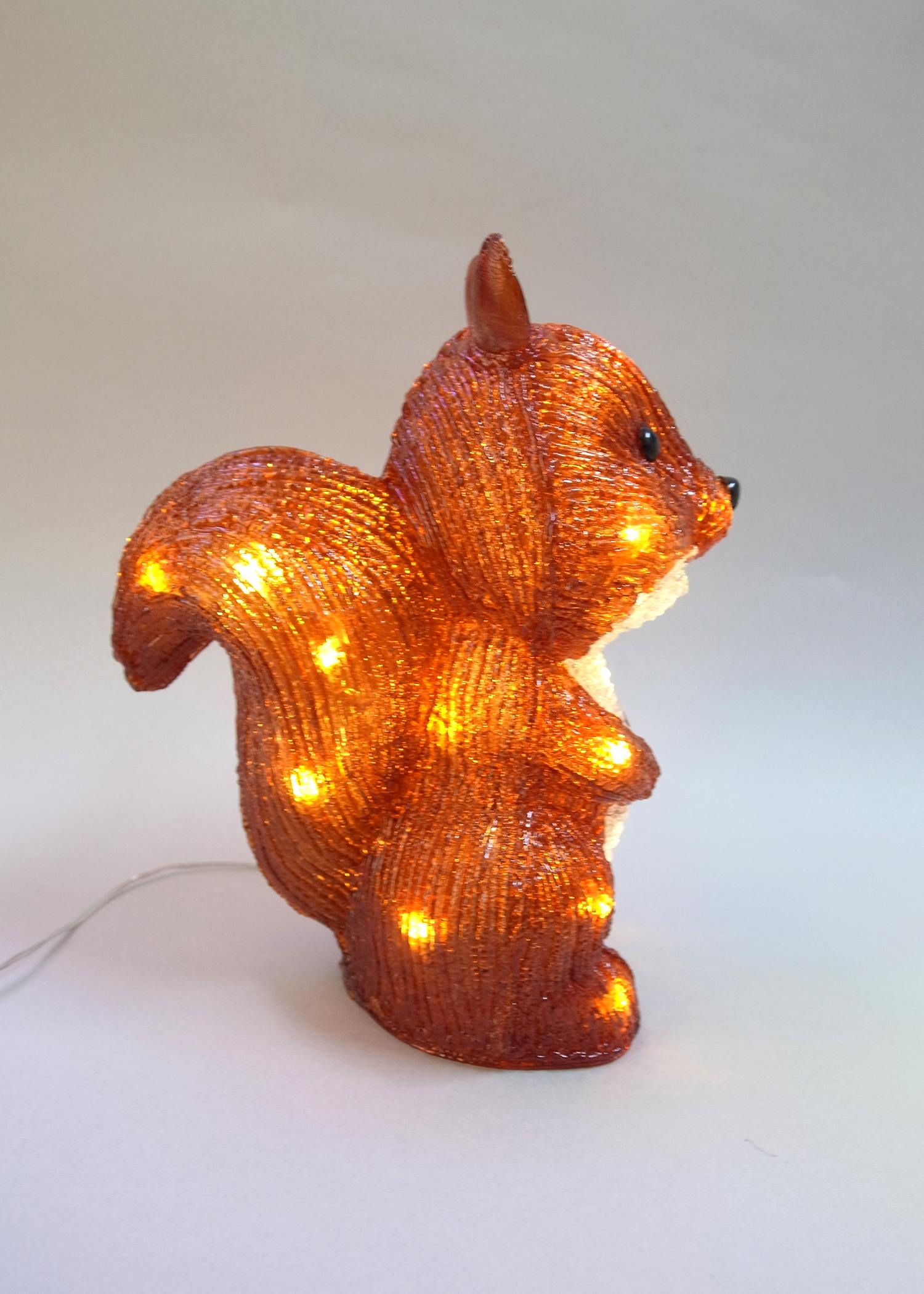 幅24cm×奥行15cm×高さ30cmのリス立体モチーフライトです。電球色LED24球搭載で温かみのある輝き。4.5Vアダプター付きで常点灯タイプ。IPX4防水規格対応で屋外設置に最適。消費電力1W、重量約0.9kg。アクリル素材で可愛いデザイン。