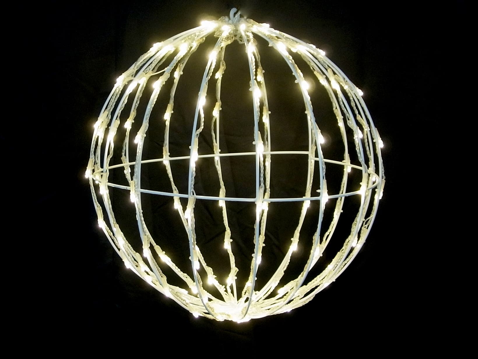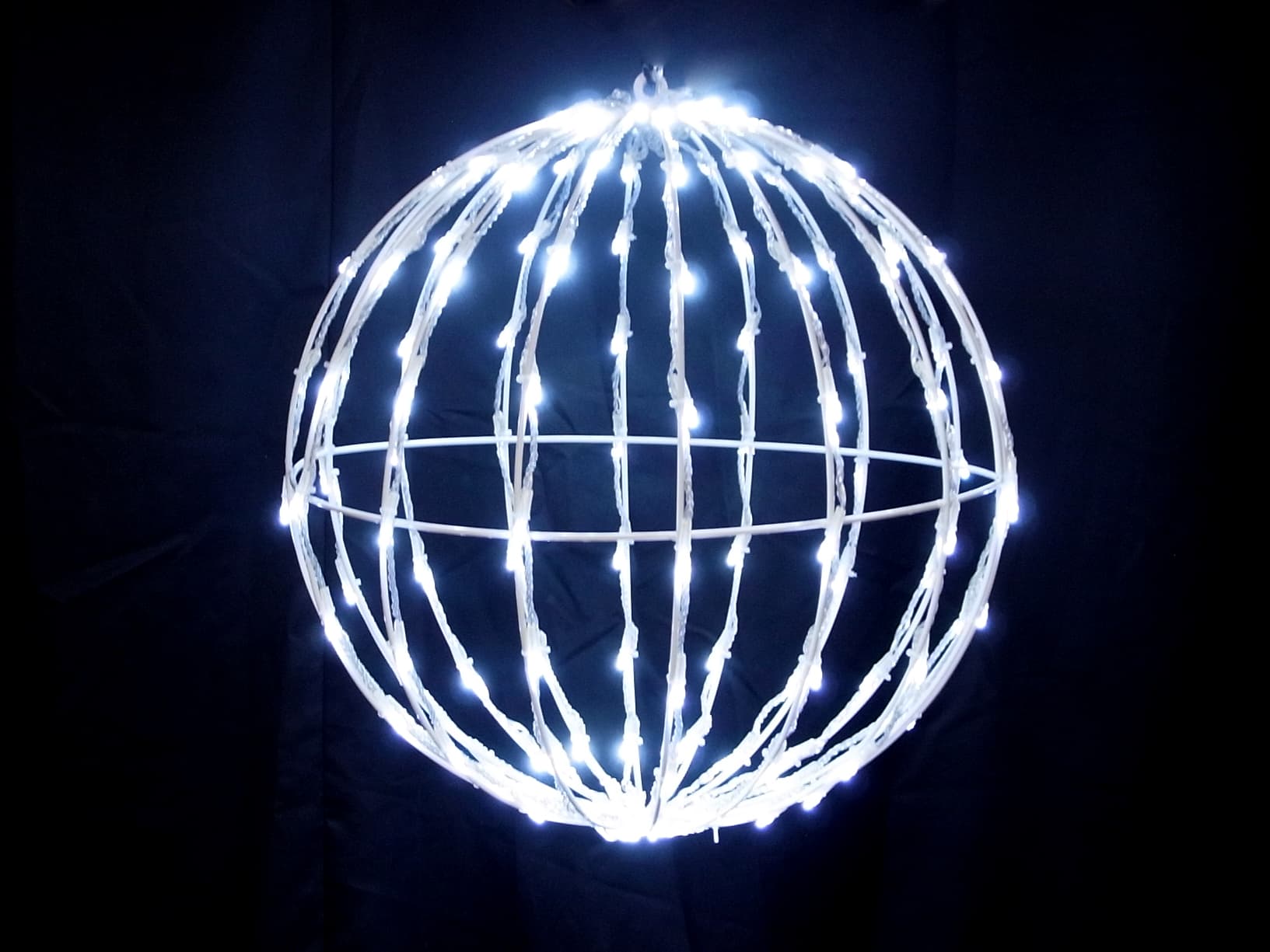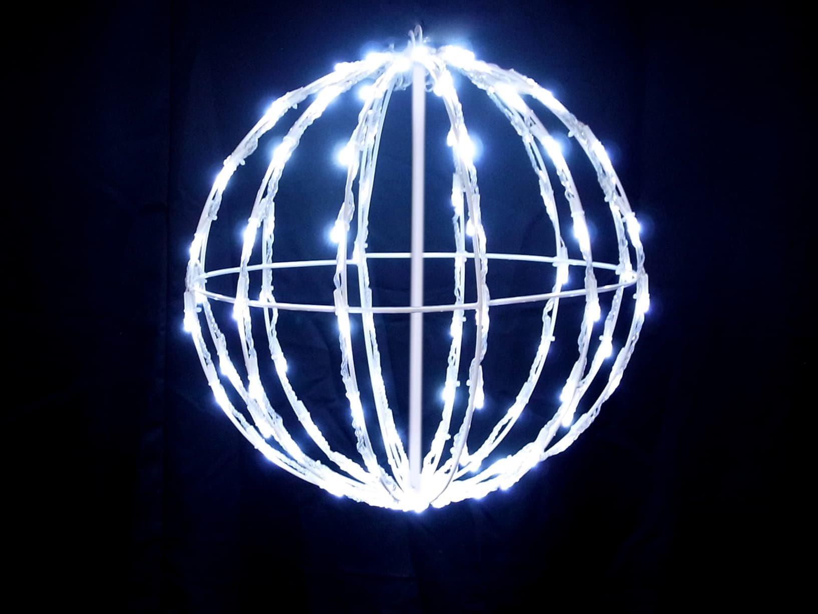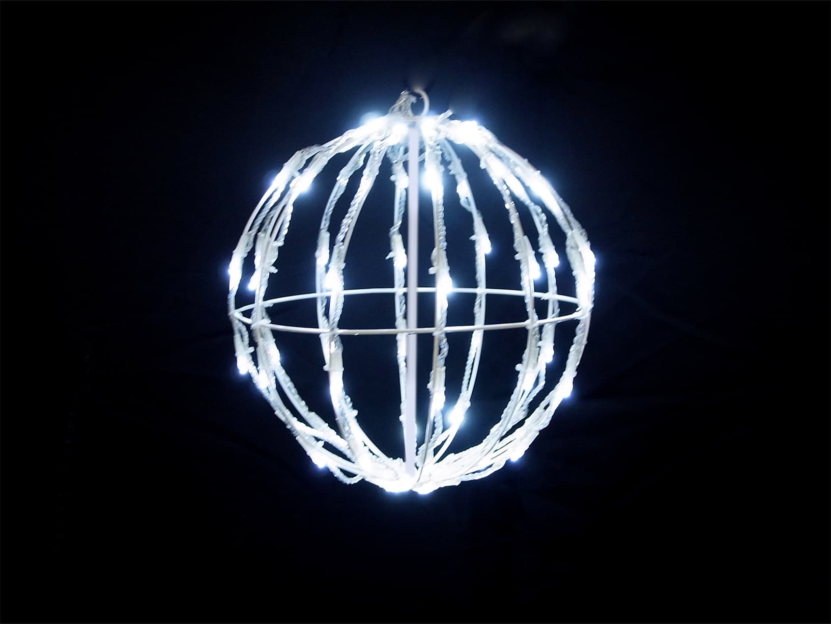 直径50cmの球体モチーフライトです。温かみのある電球色LED150球搭載で優しい輝き。常点プラグコード180cm付きで30W迄連結可能、延長コード(SLEC)使用可能。IPX4防水規格対応で屋外設置に最適。100V電源で消費電力5W、組立式。