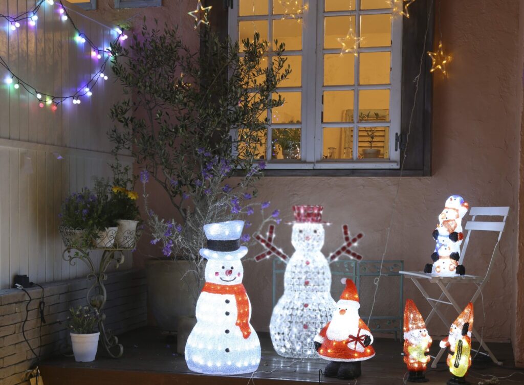 幅38cm×奥行38cm×高さ72cmのホワイトスノーマン立体モチーフライトです。白色LED160球搭載で明るく輝きます。4.5Vアダプター付きで常点灯タイプ。IPX4防水規格対応で屋外設置に最適。消費電力2W、重量約5kg。PS素材で耐久性抜群。