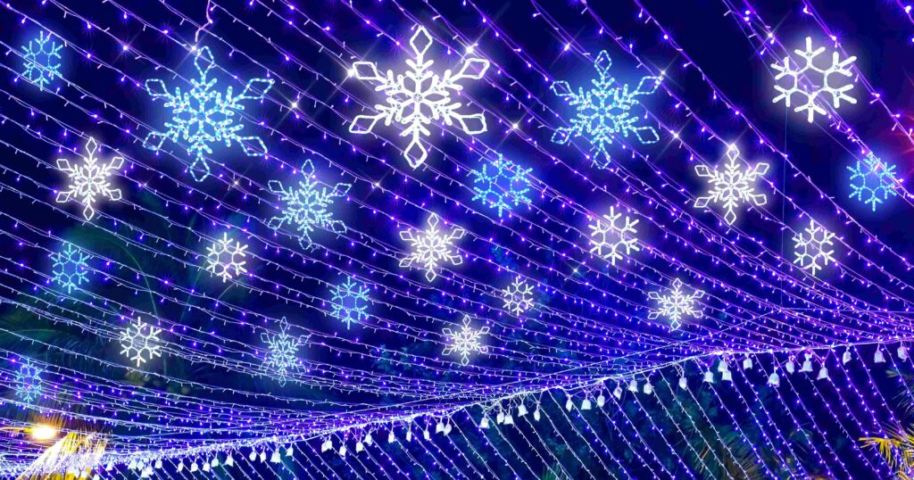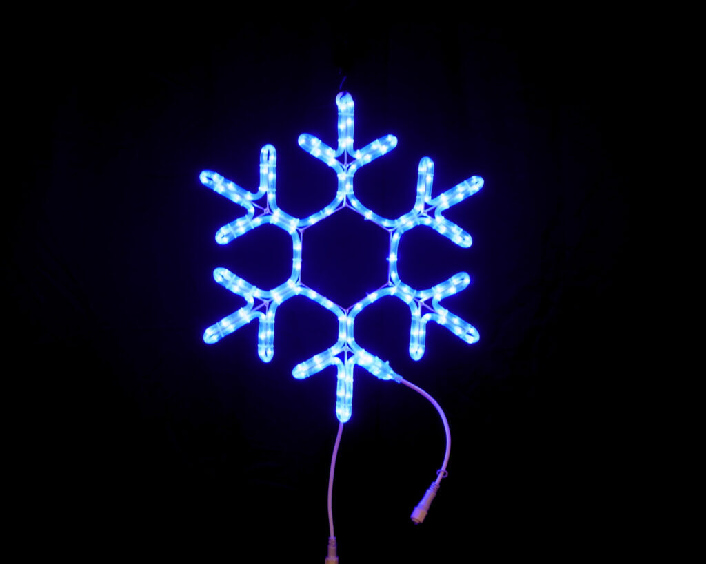 幅45cm×高さ45cmの枝のようなデザインの雪の結晶モチーフライトです。クールな青色で爽やかな輝き。常点プラグコード180cm付きで80W迄連結可能。IPX4防水規格対応で屋外設置に最適。100V電源で消費電力9W、重量約1.7kg。