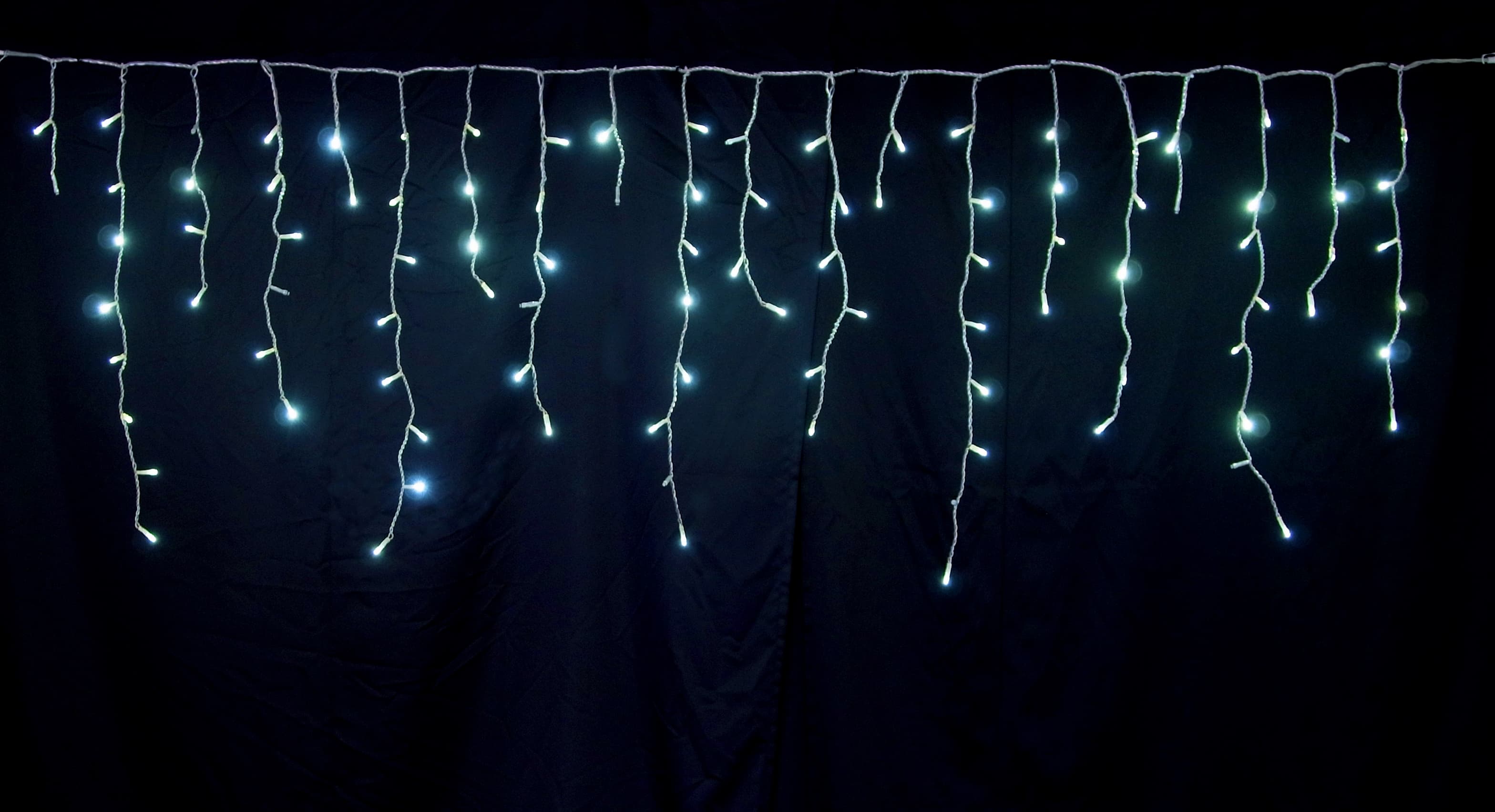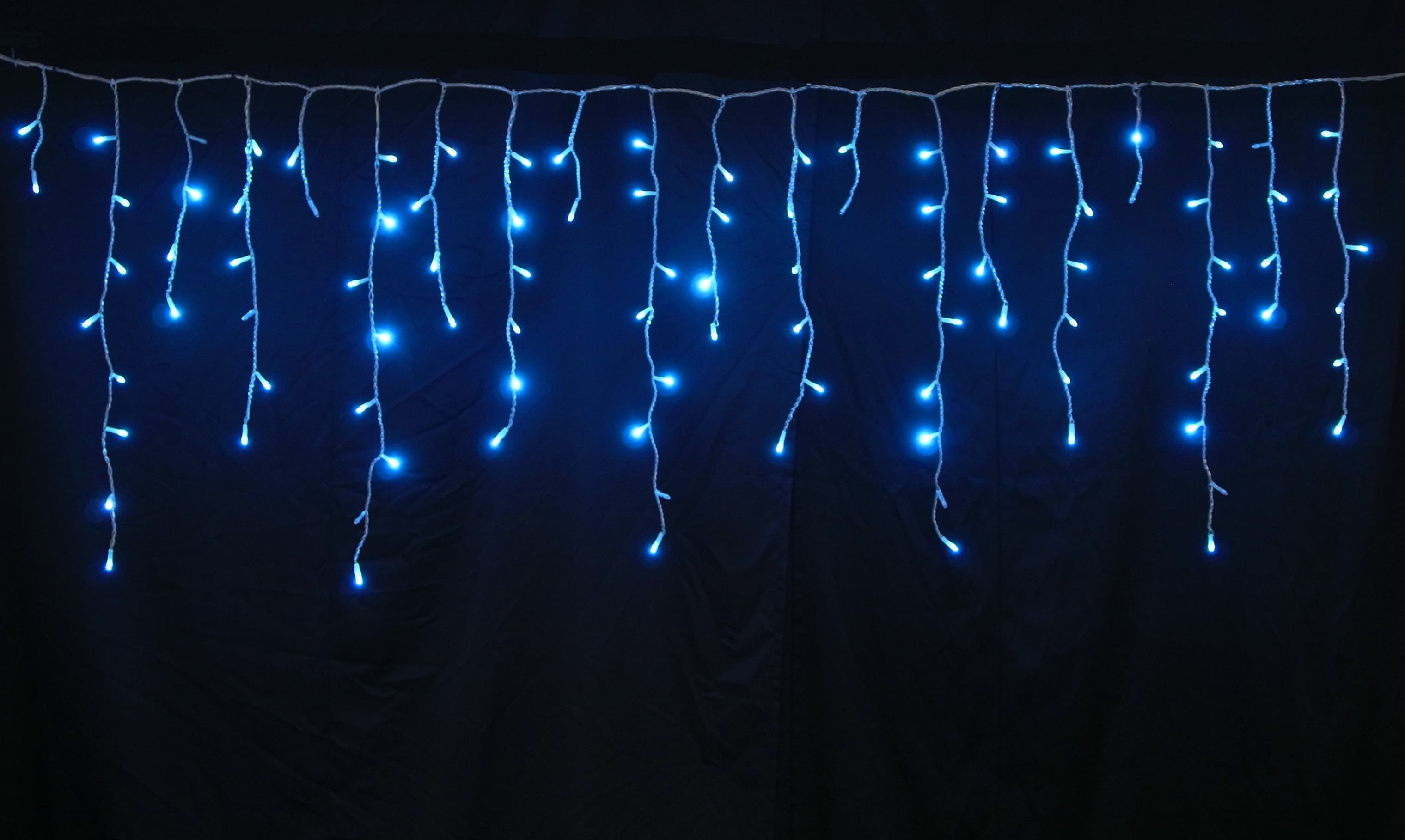 爽やかなスカイブルーが一部だけ瞬くつららライト。下がり1本につき1球の自動点滅で、神秘的な演出を実現。W220cm×H80cmサイズでIPX4防水、最大9連結対応。冬の軒先装飾に最適です。