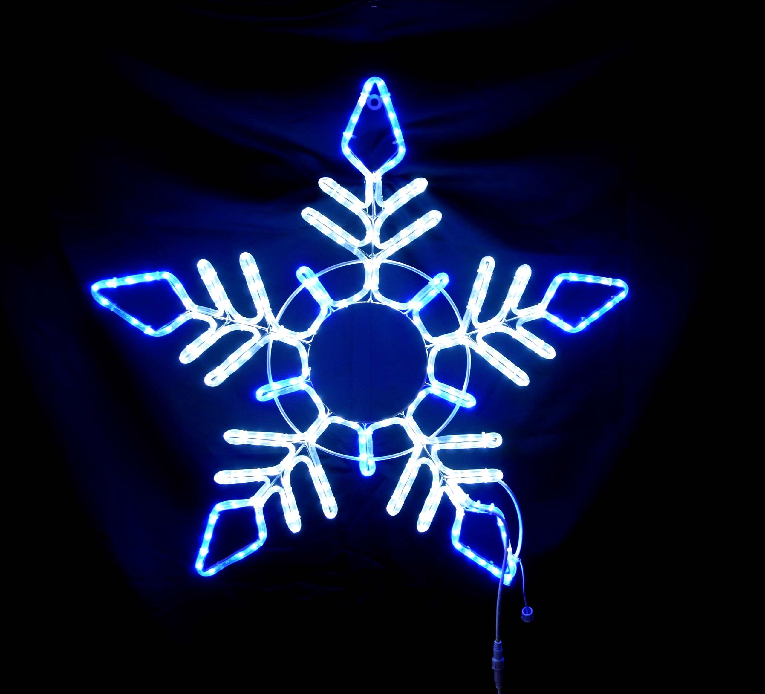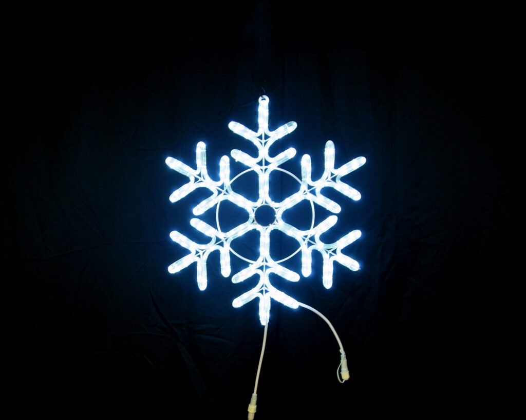 幅80cm×高さ80cmの大型雪の結晶モチーフライトです。一部が自動で点滅するフラッシュ機能搭載。電源コード180cm付きで80W迄連結可能、延長コード(MEC180)使用可能。IPX4防水規格対応で屋外設置に最適。100V電源で消費電力25W、重量約4.8kg。
