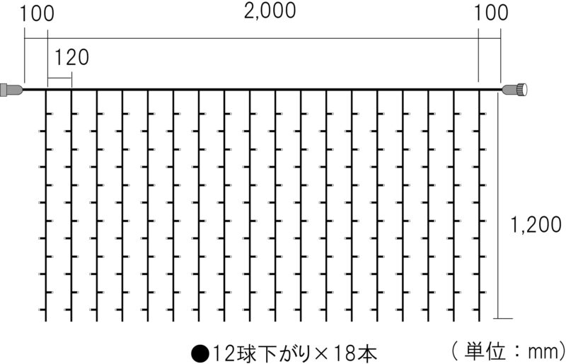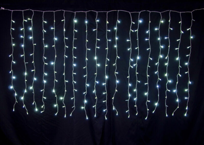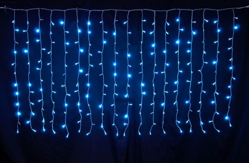 爽やかなスカイブルーが一部だけ瞬くカーテンライト。下がり1本につき1〜2球の自動点滅で、神秘的な演出を実現。W200cm×H120cmサイズでIPX4防水、最大4連結対応です。