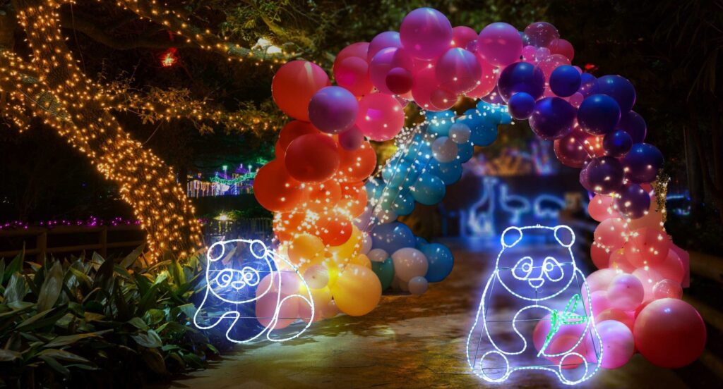 幅90cm×高さ100cmの可愛いパンダモチーフライトです。常点プラグコード180cm付きで常点灯タイプの安定した輝き。IPX4防水規格対応で屋外設置に最適。100V電源で消費電力27W、重量約3kg。LEDチューブライト使用で銅線・PVC・金属素材。動物園やテーマパークにもおすすめです。