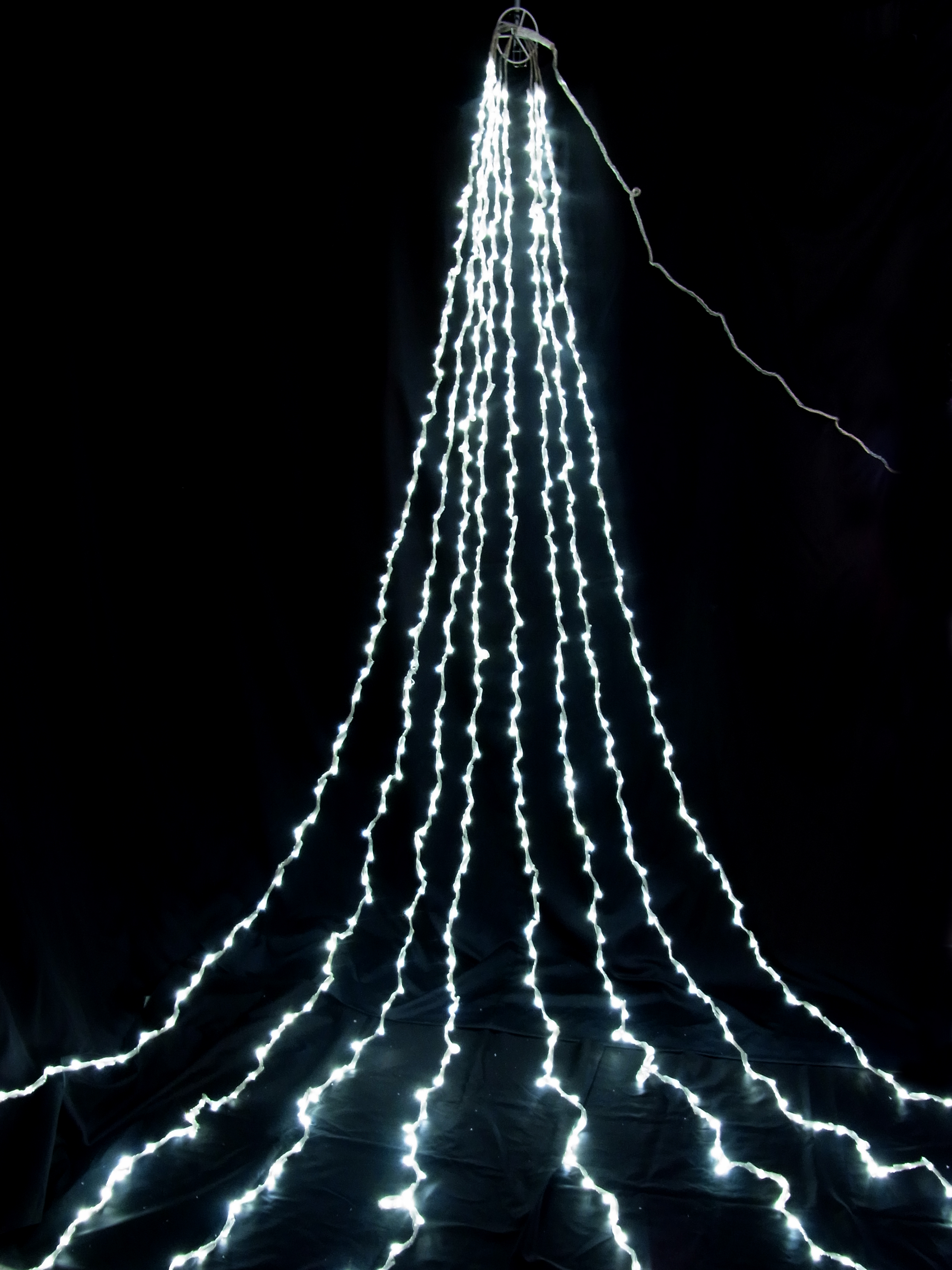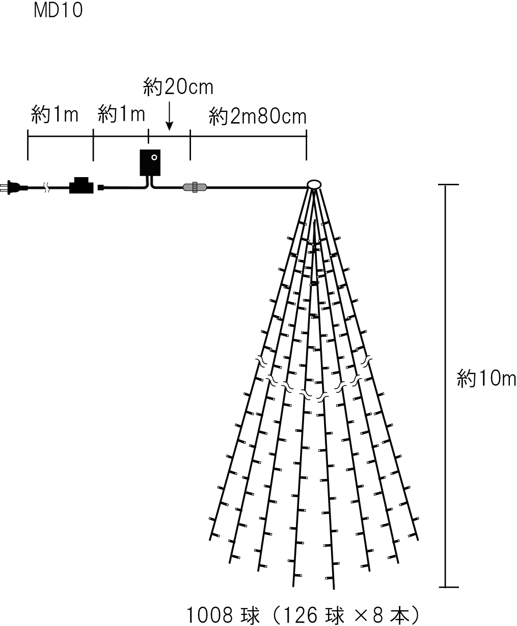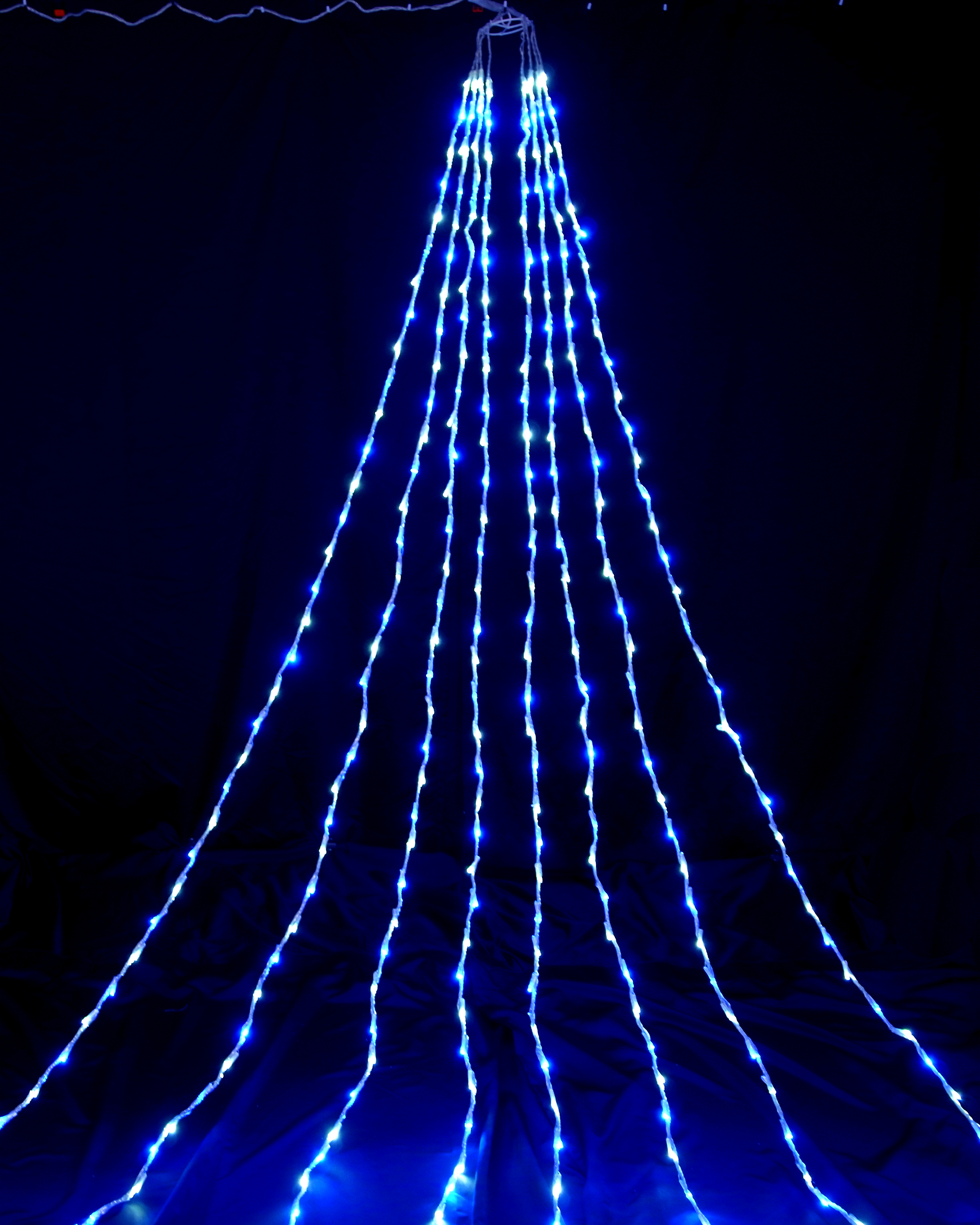爽やかな白・青の10m大型ドレープライト。1008球の光が流れるように点滅し、スピードコントローラーで調節可能。L1000cmサイズでIPX4防水、冬の大規模演出に最適です。