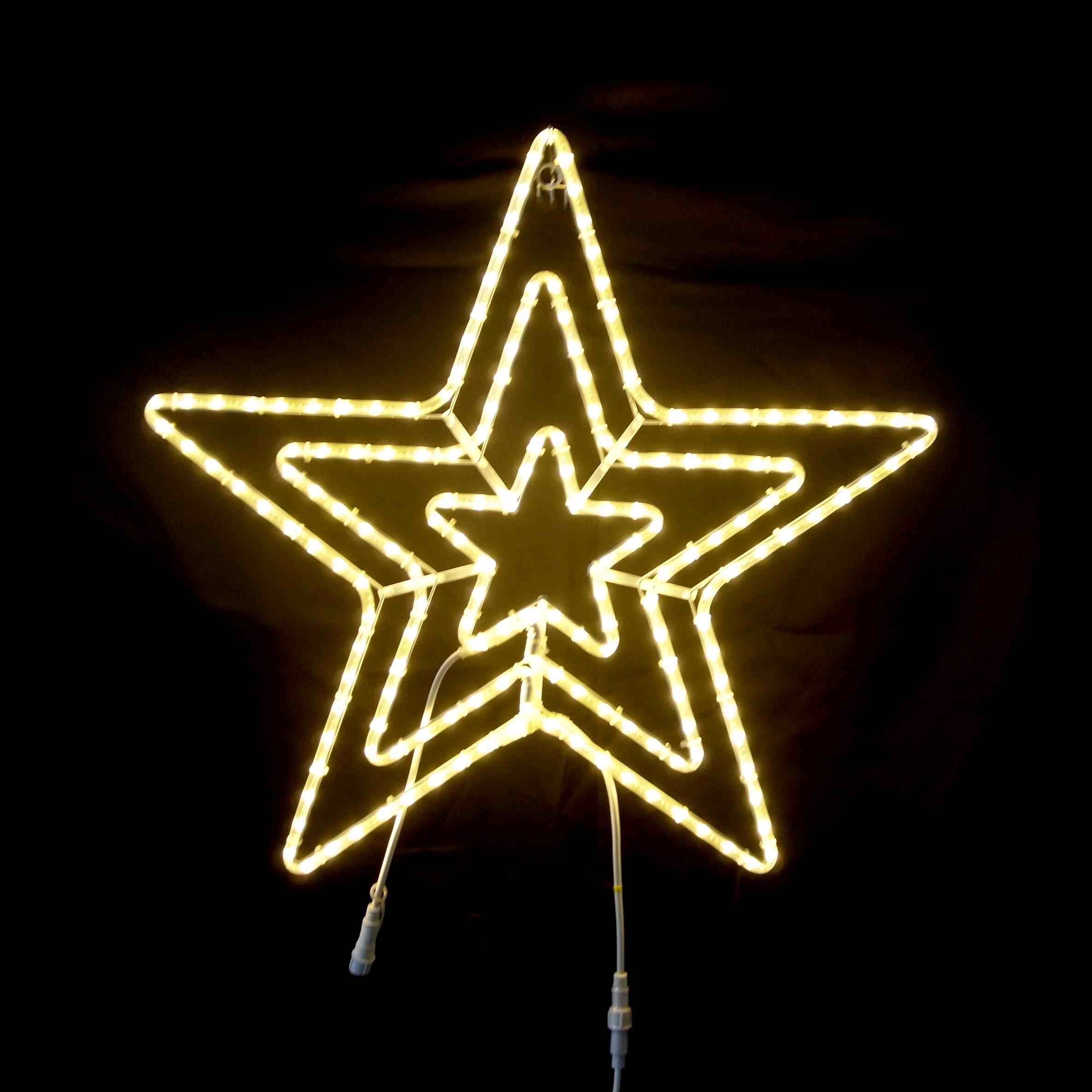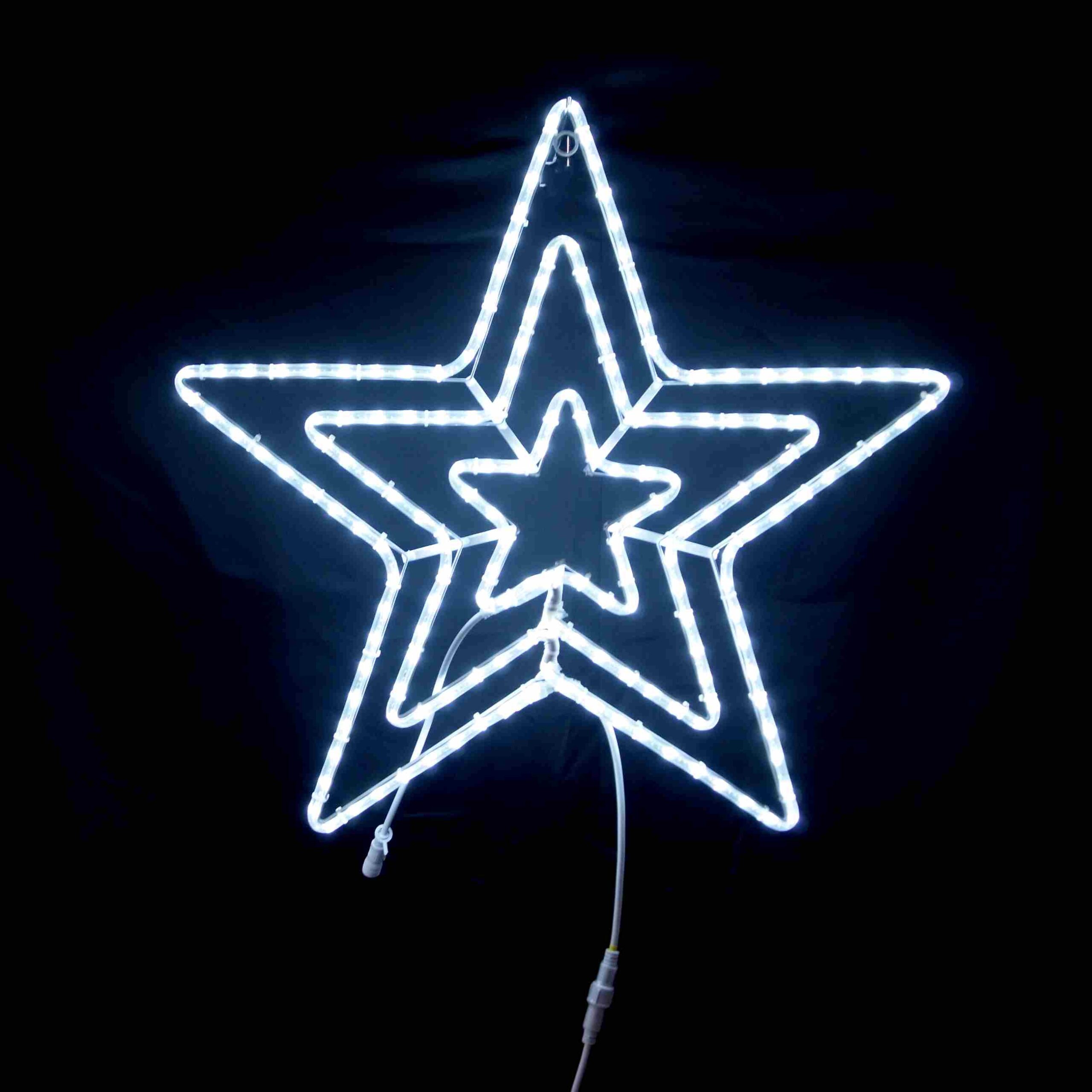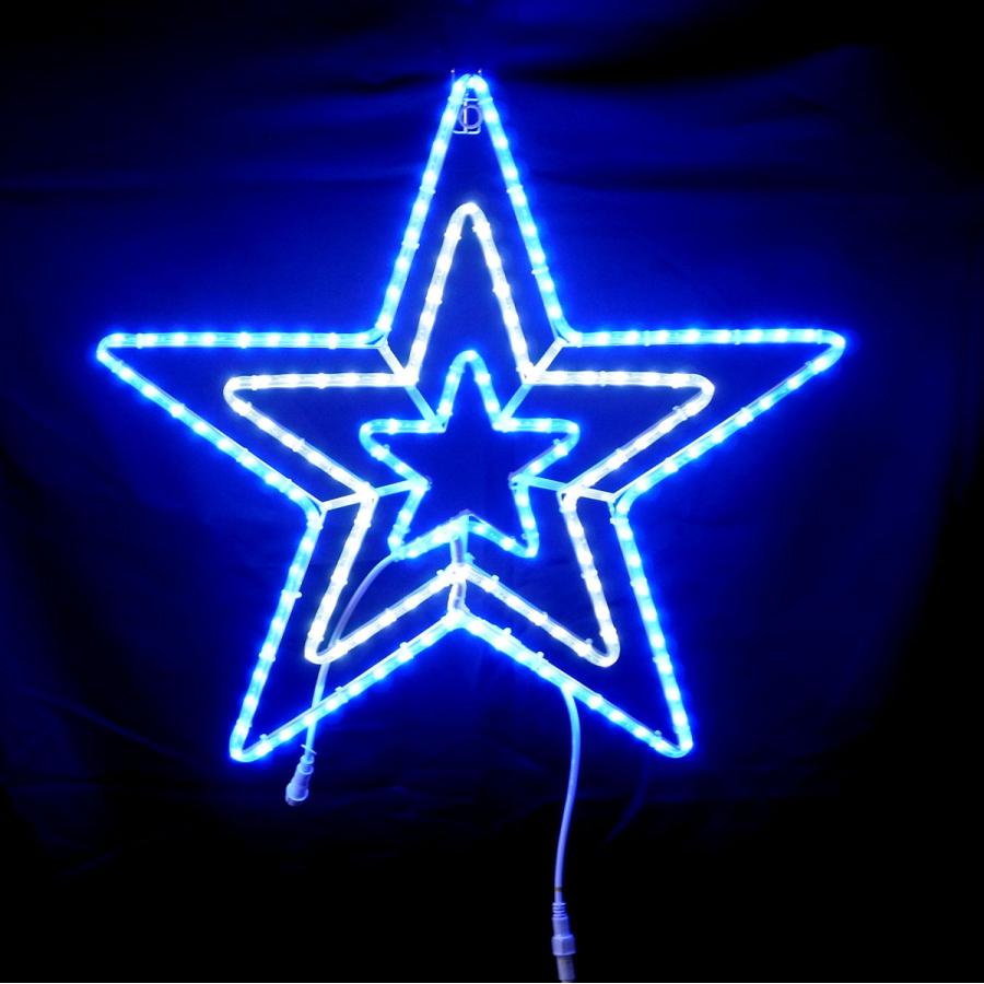 幅70cm×高さ70cmの3つの星が重なるデザインのモチーフライトです。白と青の爽やかな組み合わせ。常点プラグコード180cm付きで80W迄連結可能。IPX4防水規格対応で屋外設置に最適。100V電源で消費電力10W、重量約2kg。