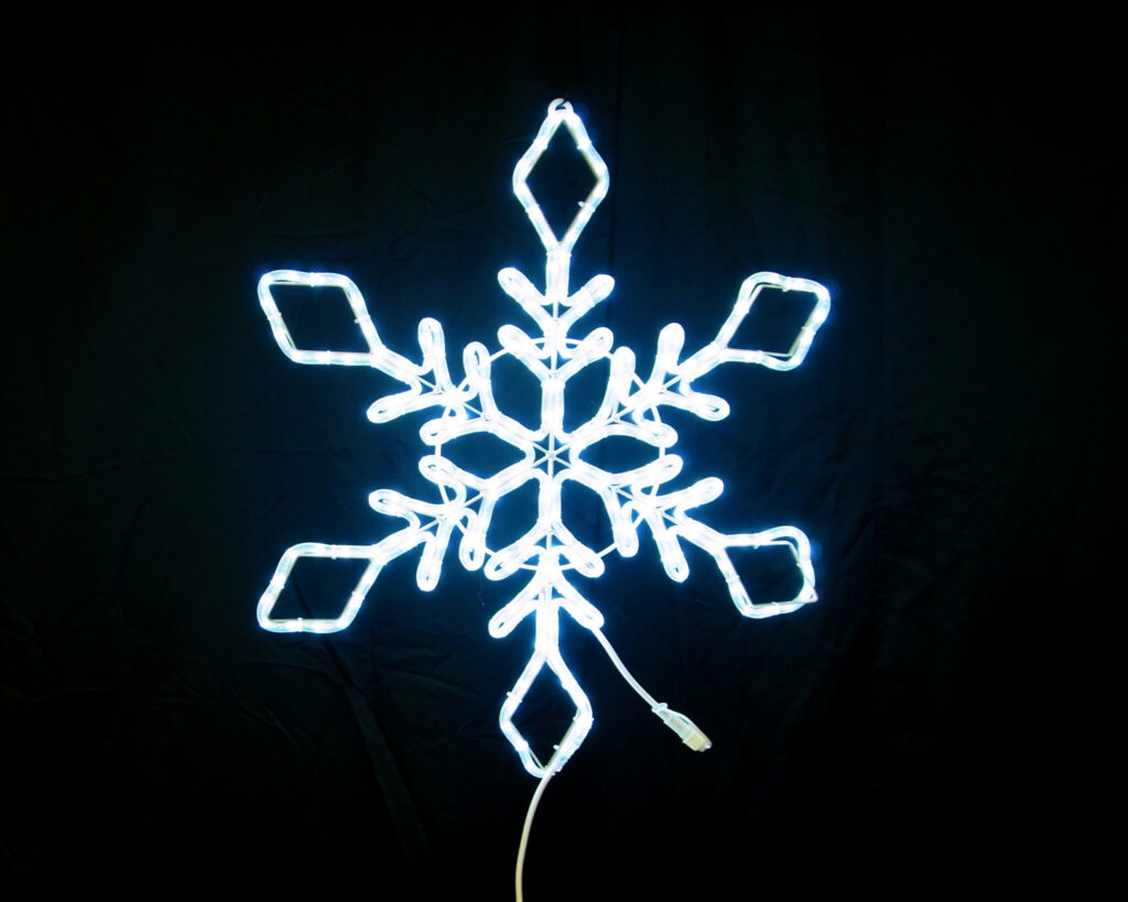 幅70cm×高さ70cmのダイヤ形デザインの雪の結晶モチーフライトです。白と青の爽やかな組み合わせ。常点プラグコード180cm付きで80W迄連結可能。IPX4防水規格対応で屋外設置に最適。100V電源で消費電力16W、重量約1.4kg。