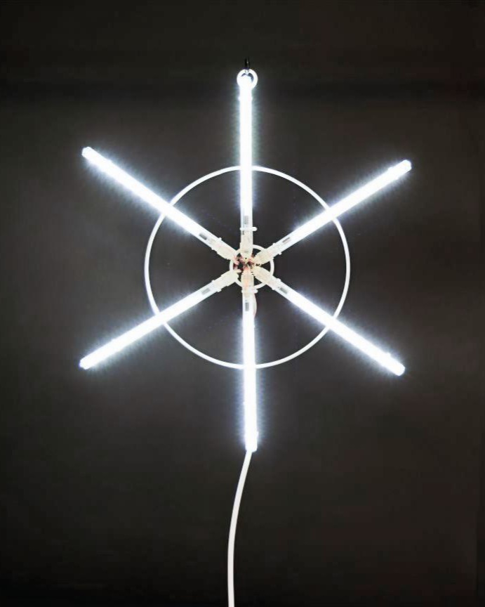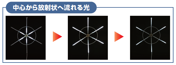 中心から放射状へ流れる白い光が、空間に動きを生み出す大型オブジェライト。φ60cmの存在感あるサイズでIPX4防水、12Vの安全設計。アダプター付きで、ダイナミックな演出を実現します。
