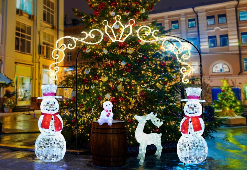 幅90cm×奥行50cm×高さ120cmの大型スノーマン立体モチーフライトです。LED252球搭載で豪華な輝き。常点プラグコード180cm付きで組立式。IPX4防水規格対応で屋外設置に最適。100V電源で消費電力11W、重量約5.5kg。メイン装飾に最適です。
