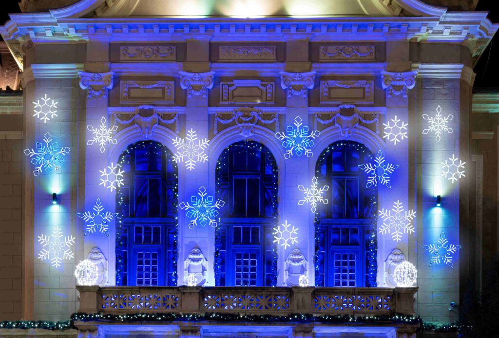 幅80cm×高さ80cmの大型雪の結晶モチーフライトです。常点プラグコード180cm付きで80W迄連結可能、延長コード(MEC180)使用可能。IPX4防水規格対応で屋外設置に最適。100V電源で消費電力24W、重量約5kg。存在感のある冬の装飾に最適です。