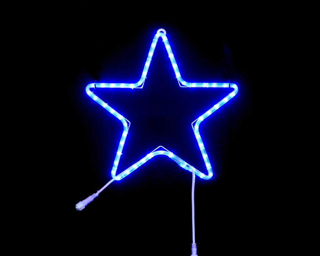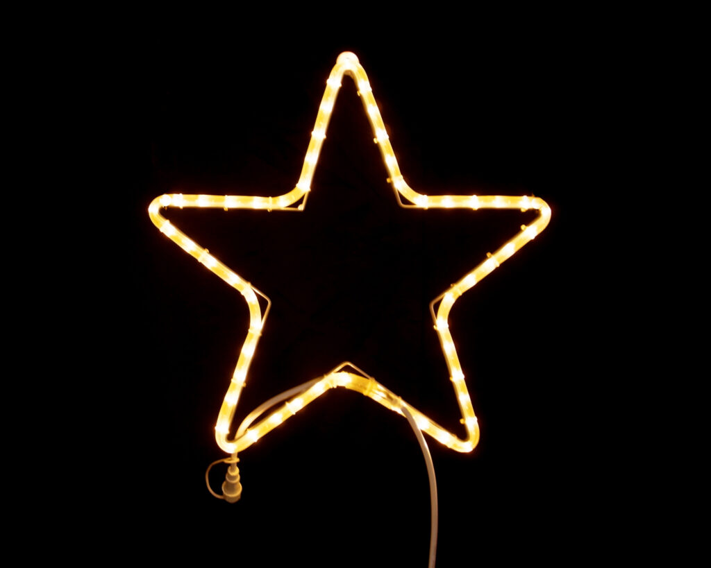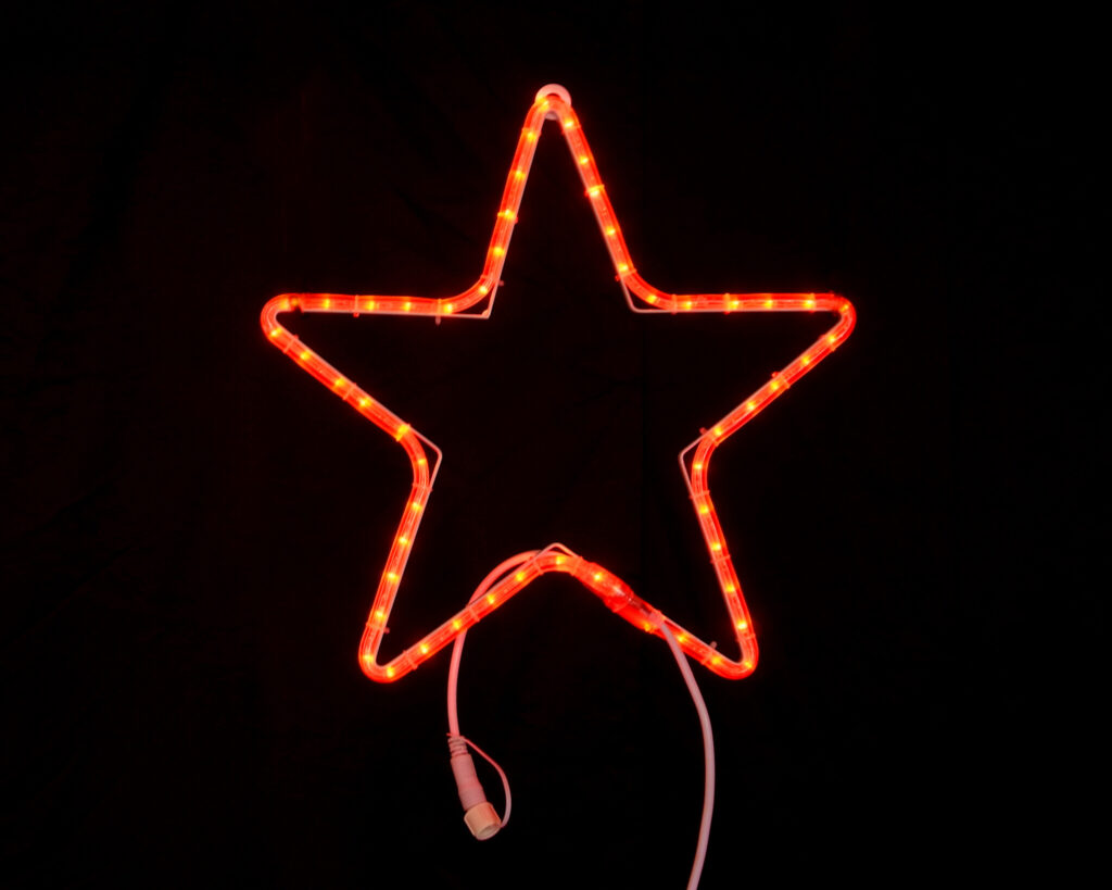 幅45cm×高さ45cmの星モチーフライトです。情熱的な赤色LEDチューブライトで鮮やかな輝き。常点プラグコード180cm付きで80W迄連結可能、延長コード(MEC180)使用可能。IPX4防水規格対応で屋外設置に最適。100V電源で消費電力3W、重量約1.1kg。