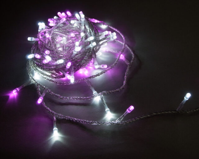 可愛らしい白・ピンクをリモコンで自在にコントロール。24Vの安全設計で、8パターン点滅・4段階調光・タイマー機能を搭載。メモリー機能付きで、最大5連結対応。ロマンチックな演出を便利に楽しめます。