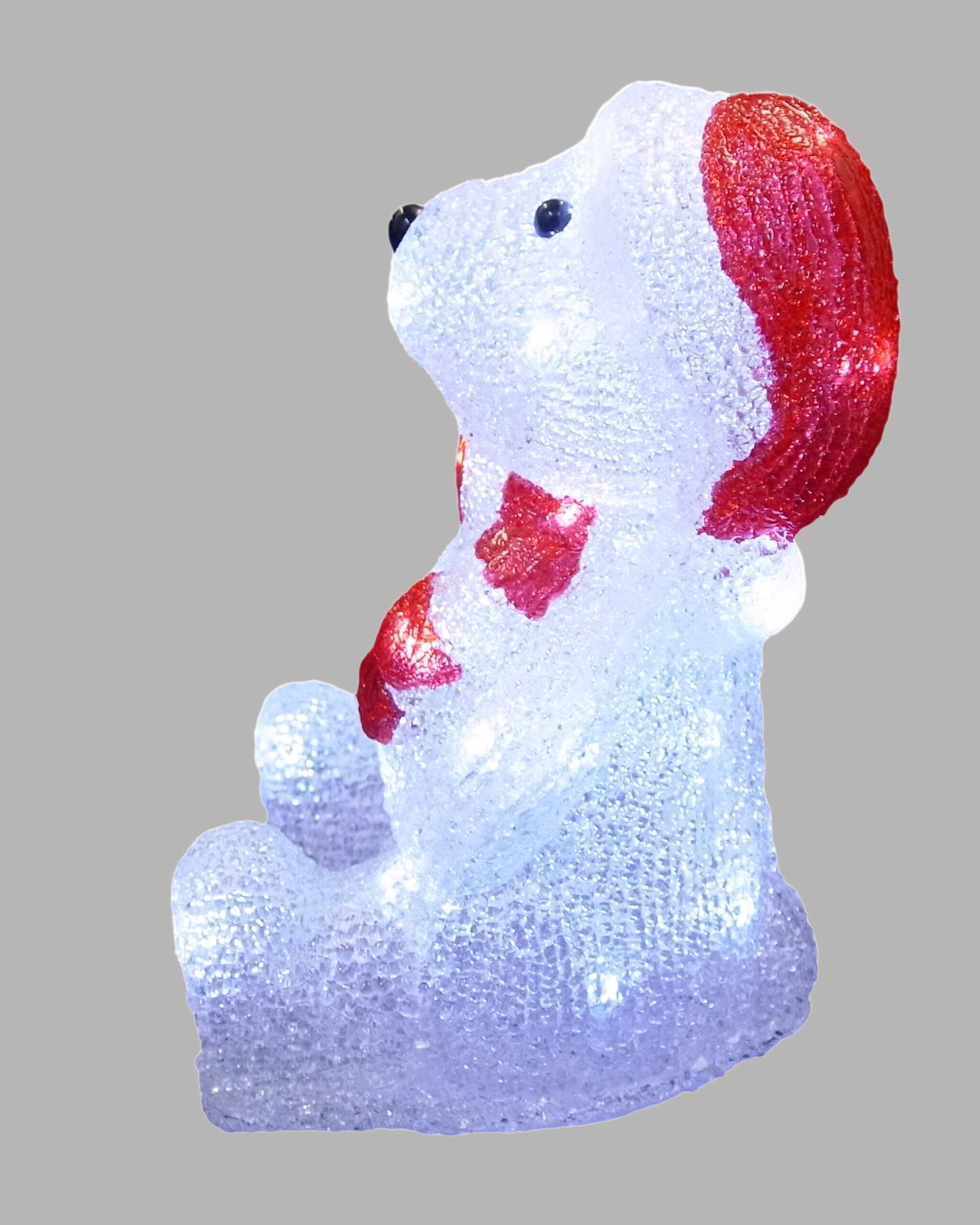 幅18cm×奥行16cm×高さ27cmの座っているベア立体モチーフライトです。白色LED30球搭載で可愛らしい輝き。5Vアダプター付きでアダプターコード3m。IPX4防水規格対応で屋外設置に最適。消費電力3W、重量約0.8kg。アクリル素材。