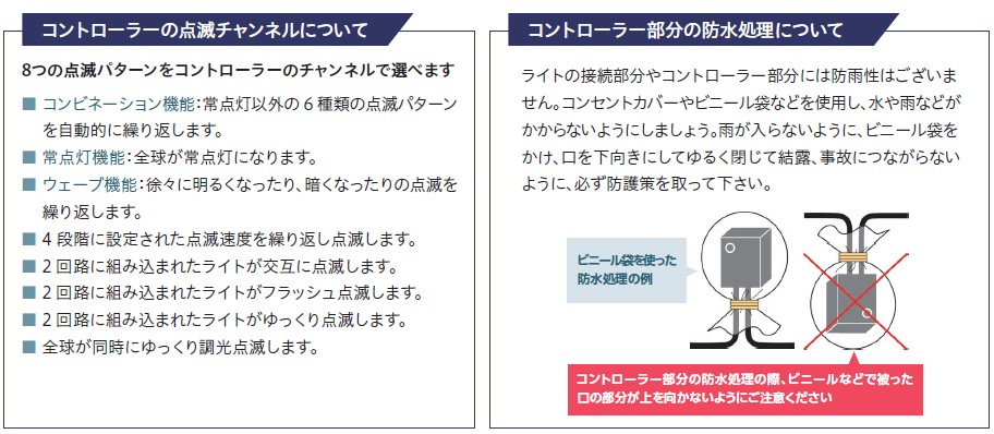 LRKストレートライト、ネットライト専用の8パターン点滅コントローラー付きプラグコード。最大負荷容量70Wで複数ライトに対応、華やかな点滅から常点灯まで演出を選択可能。230cmの長さで設置の自由度が高く、イベントやパーティーの動きのある装飾に最適です。