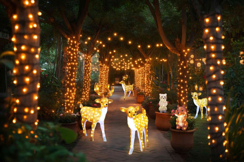幅59cm×奥行27cm×高さ70cmの可愛いコジカ立体モチーフライトです。白色LED100球搭載で優しい輝き。24Vアダプター付きで電源コード5m、角は組立式。IPX4防水規格対応で屋外設置に最適。消費電力3W、重量約3.3kg。PS素材。