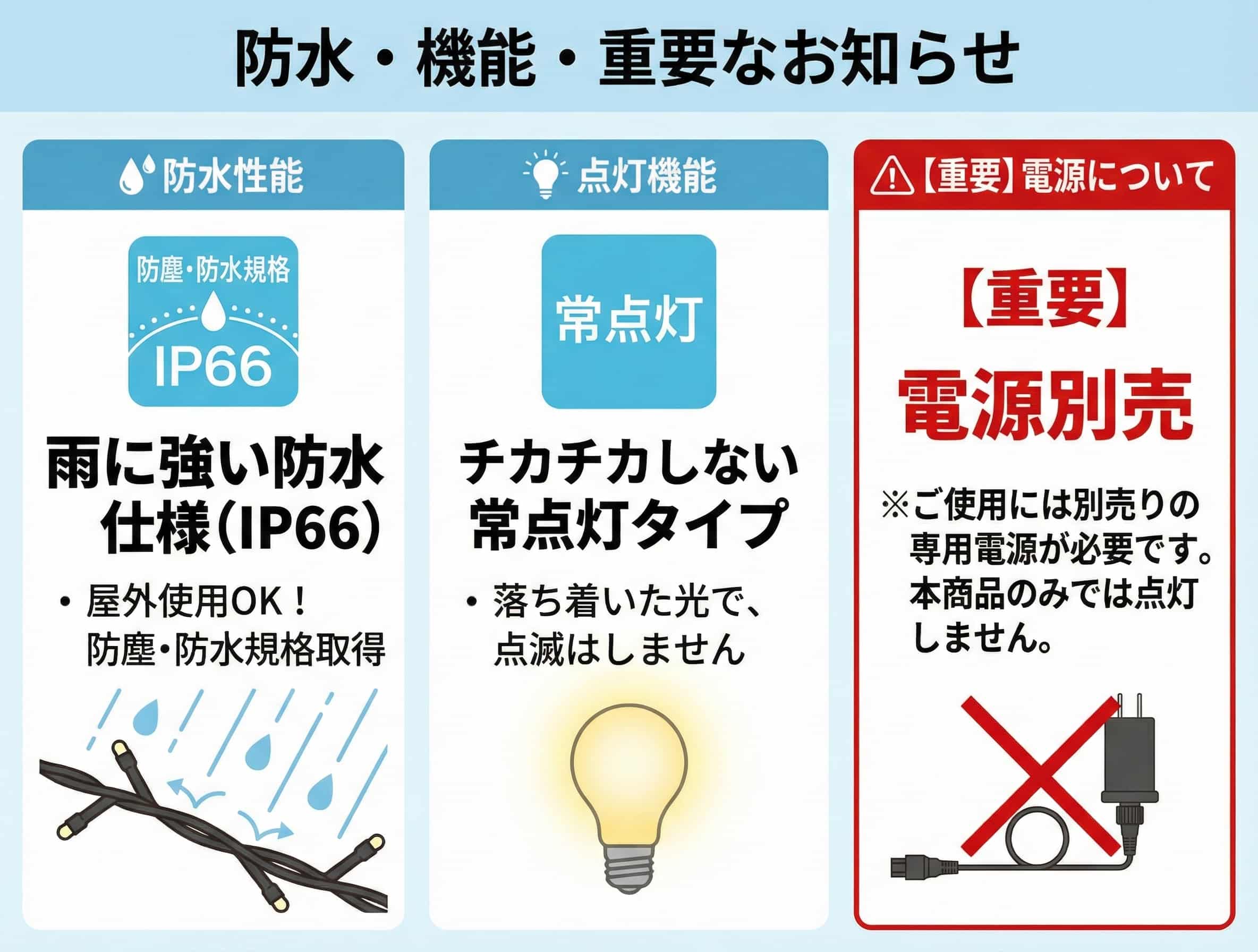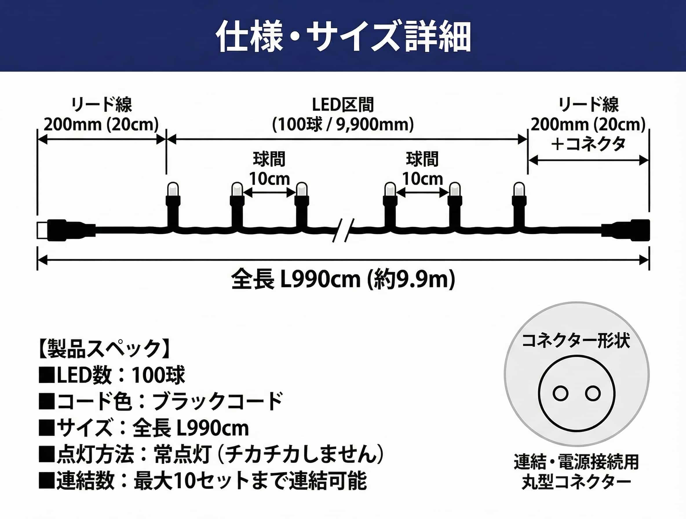 可愛らしい白・ピンクミックスを手頃な価格で。常点灯仕様で10連結対応、IP66防水で屋外も安心。桜シーズンやブライダルの大量装飾に最適なコストパフォーマンスで、ロマンチックな空間を創り出します。