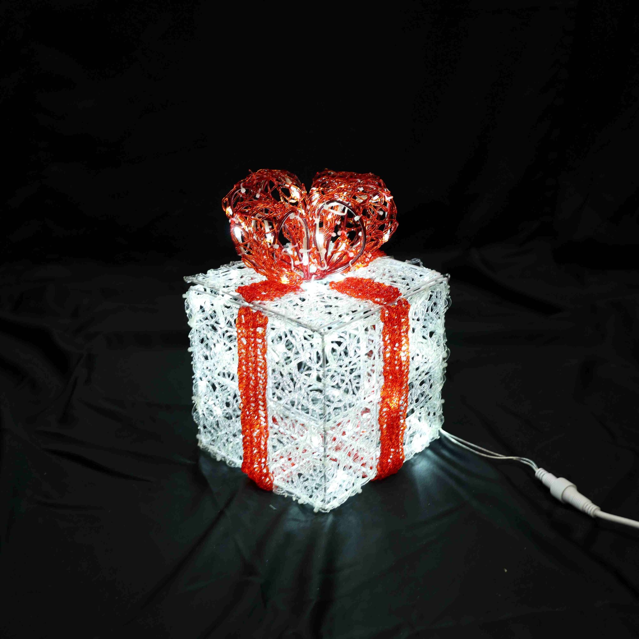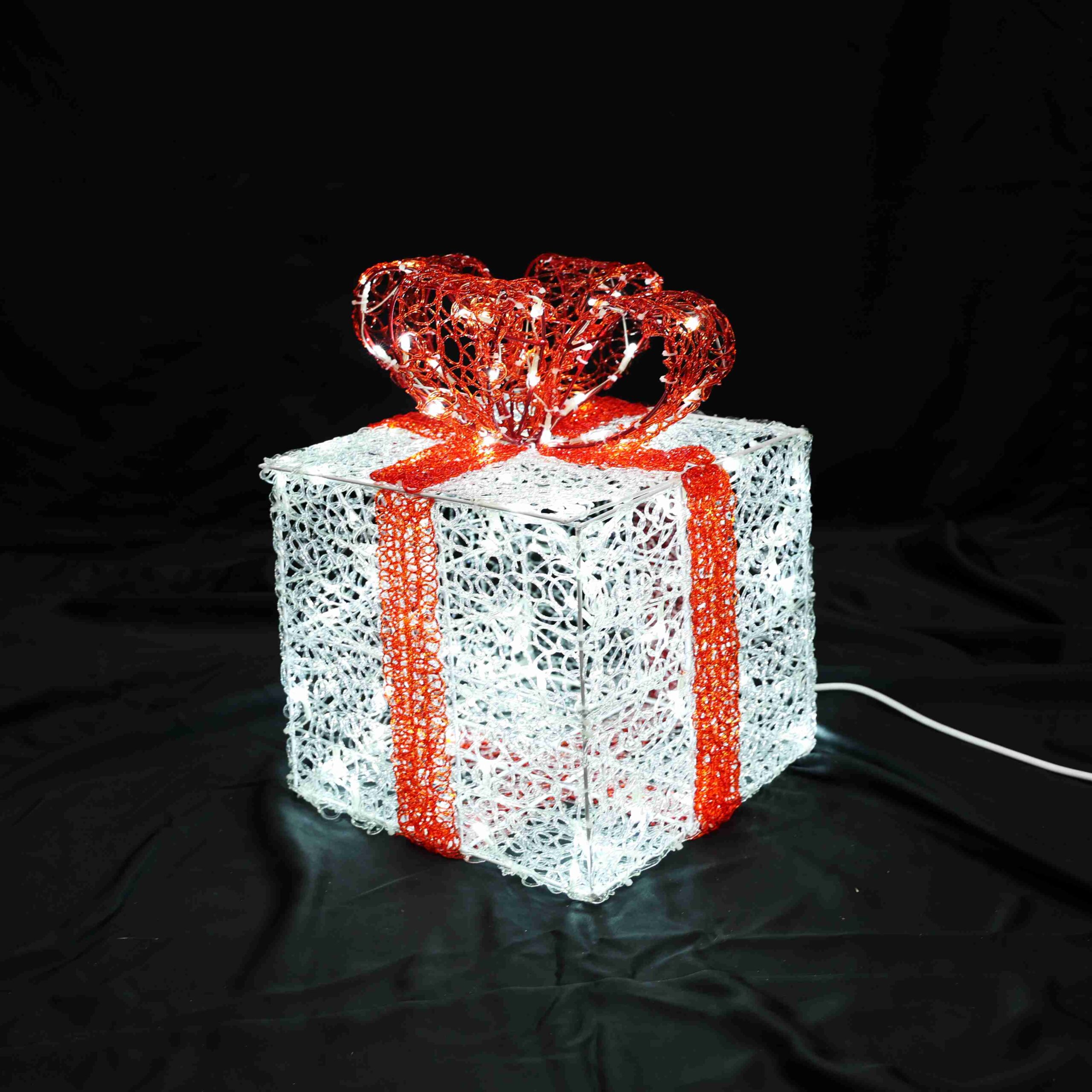 幅40cm×奥行40cm×高さ60cmのプレゼントボックスモチーフライトです。白色LED200球搭載で華やかな輝き。常点プラグコード180cm付きで常点灯タイプ。IPX4防水規格対応で屋外設置に最適。100V電源で消費電力10W、重量約3kg。