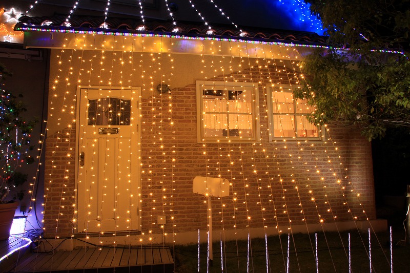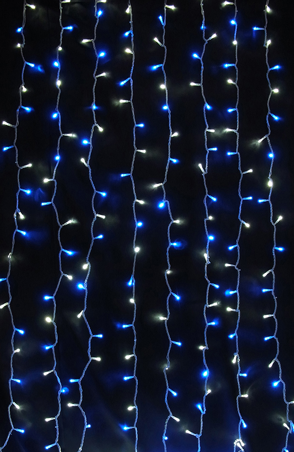 爽やかな白・青ミックスの360球カーテンライト。W110cm×H240cmの縦長サイズで冬らしい演出を実現。IPX4防水で屋外も安心、最大2連結対応。清涼感のある豪華な空間を創り出します。