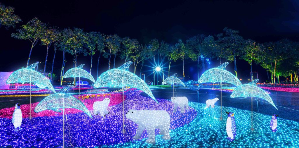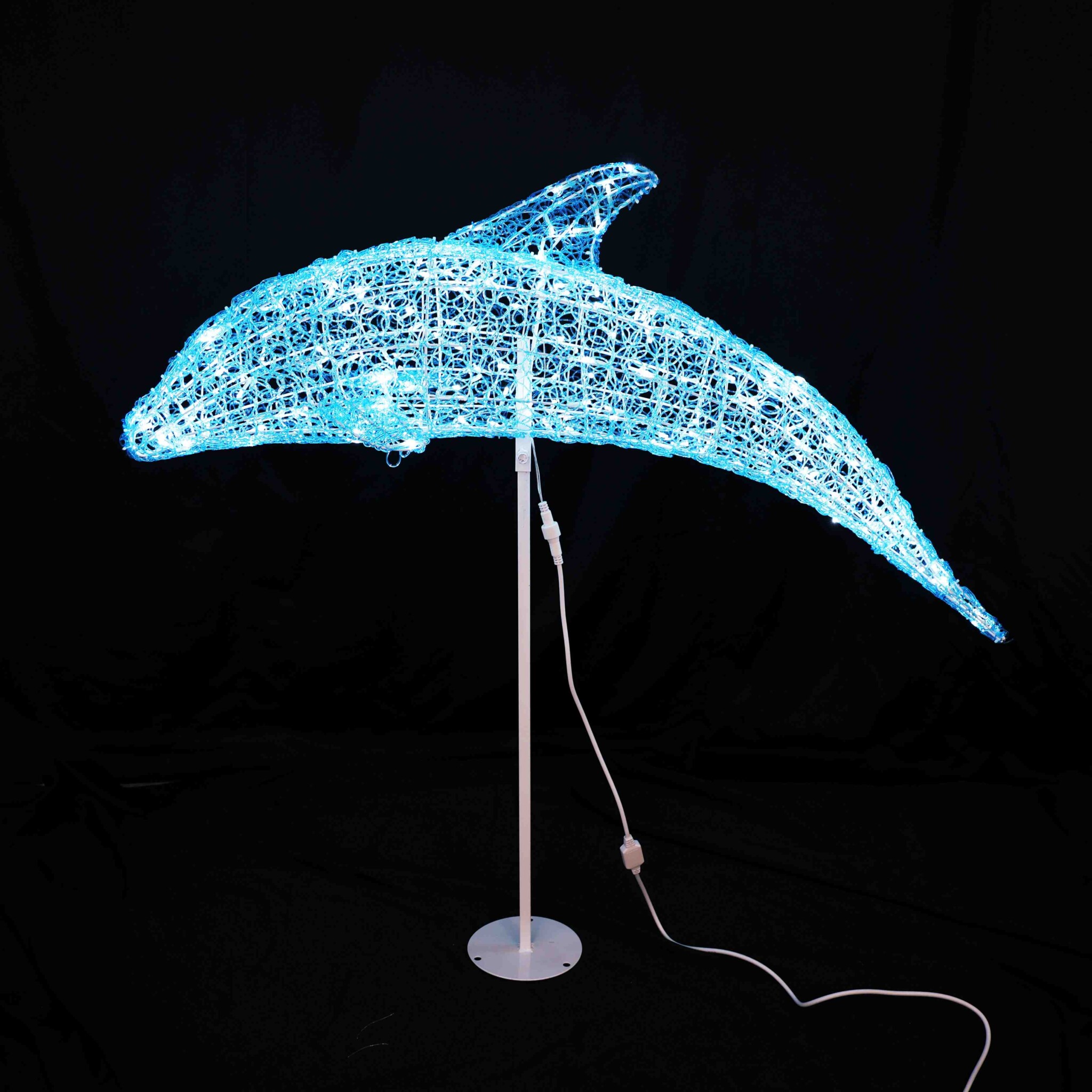 長さ120cm×直径25cm×高さ60cmの大型イルカ立体モチーフライトです。白色LED200球搭載で豪華な輝き。常点プラグコード180cm付きで組立式。IPX4防水規格対応で屋外設置に最適。100V電源で消費電力11W、重量約3kg。存在感抜群の装飾に。