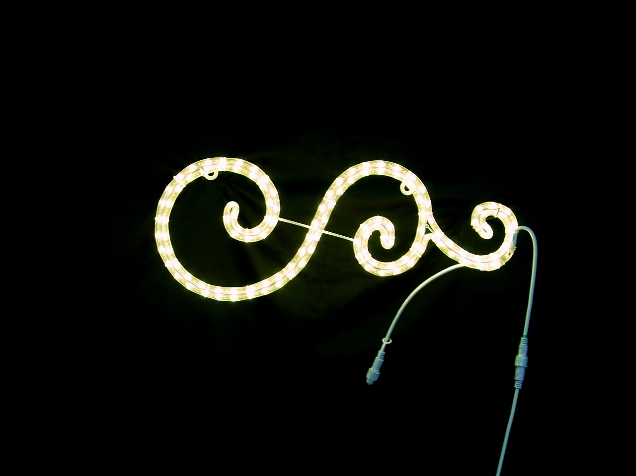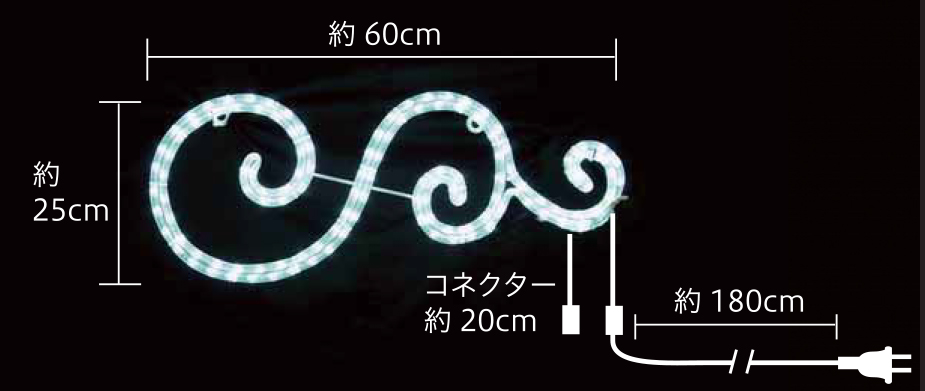 幅60cm×高さ25cmの小型アラベスク模様モチーフライトです。温かみのある電球色で落ち着いた雰囲気を演出。常点プラグコード180cm付きで80W迄連結可能。IPX4防水規格対応で屋外設置に最適。100V電源で消費電力6W、重量約0.9kgの軽量設計。