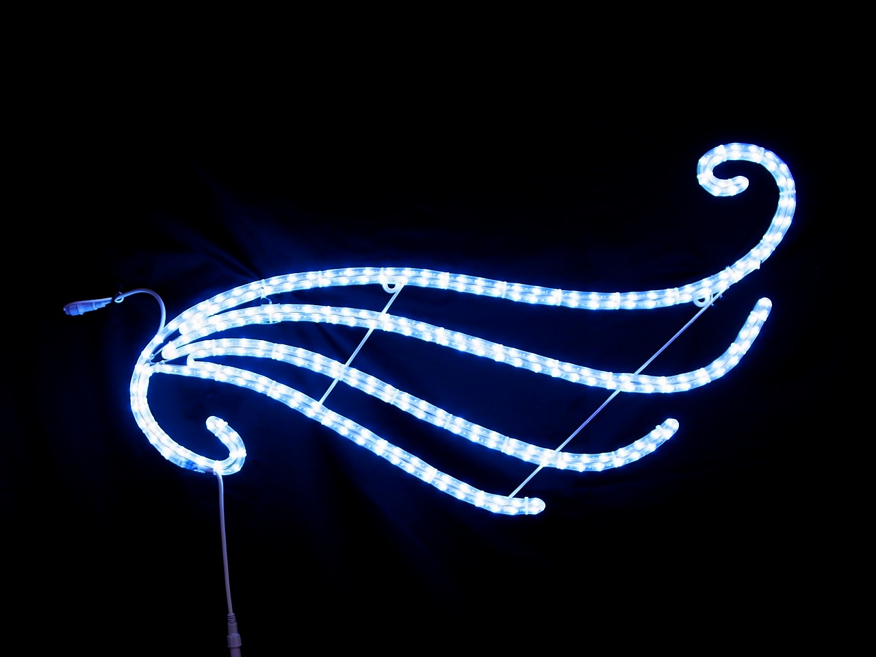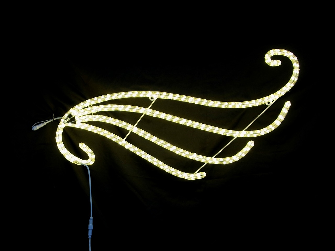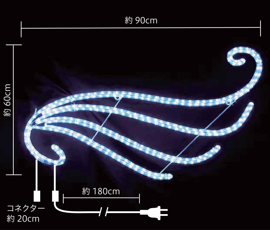 幅90cm×高さ60cmの翼モチーフライトです。温かみのある電球色で落ち着いた雰囲気を演出。常点プラグコード180cm付きで80W迄連結可能。IPX4防水規格対応で屋外設置に最適。100V電源で消費電力18W、重量約1.7kg。LEDチューブライト使用。