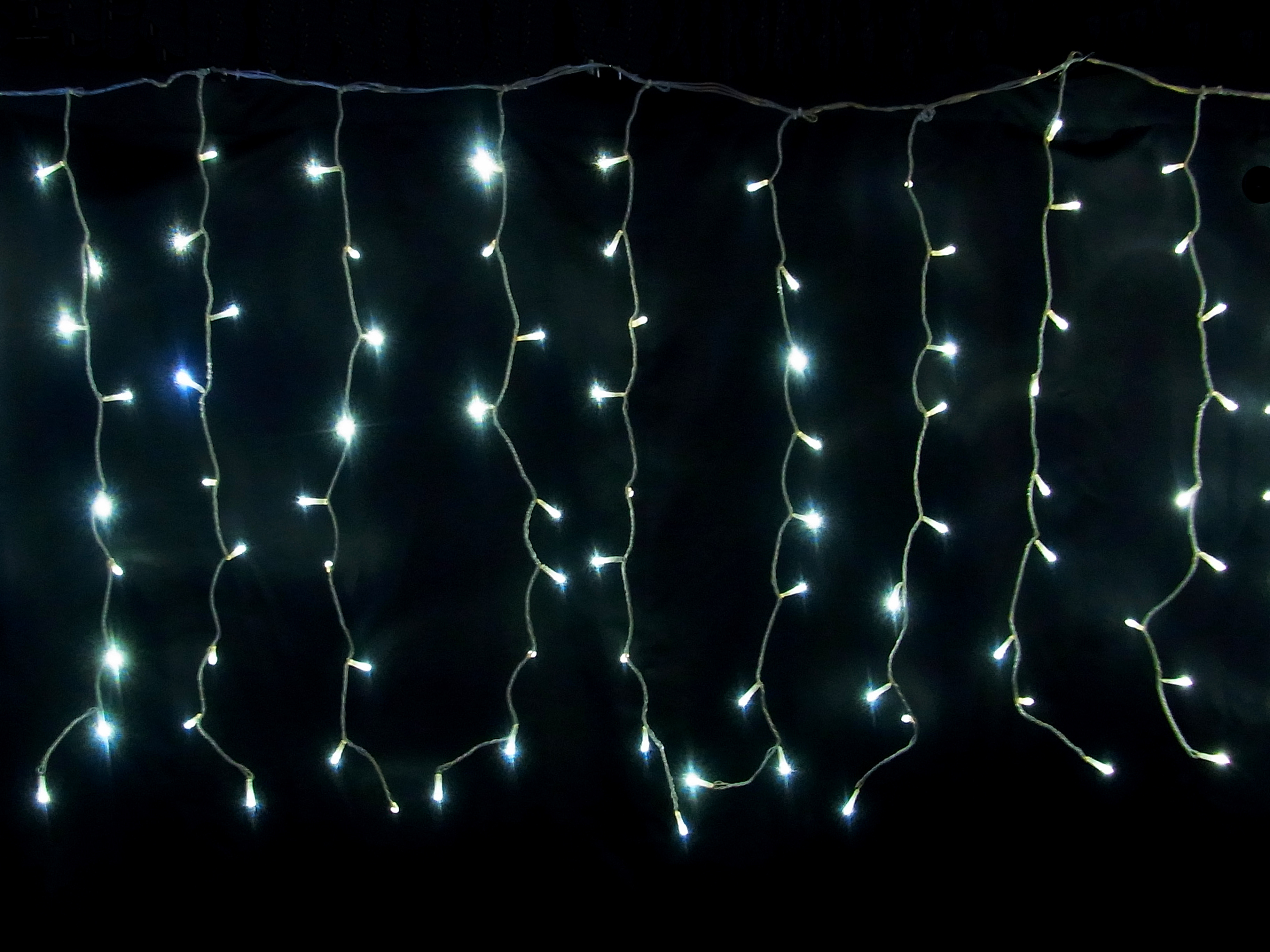 爽やかな白・青ミックスの細コードカーテンライト。W300cm×H100cmの大サイズで、冬らしい演出を実現。IPX4防水で屋外も安心、最大6連結対応。ファサード装飾に最適です。