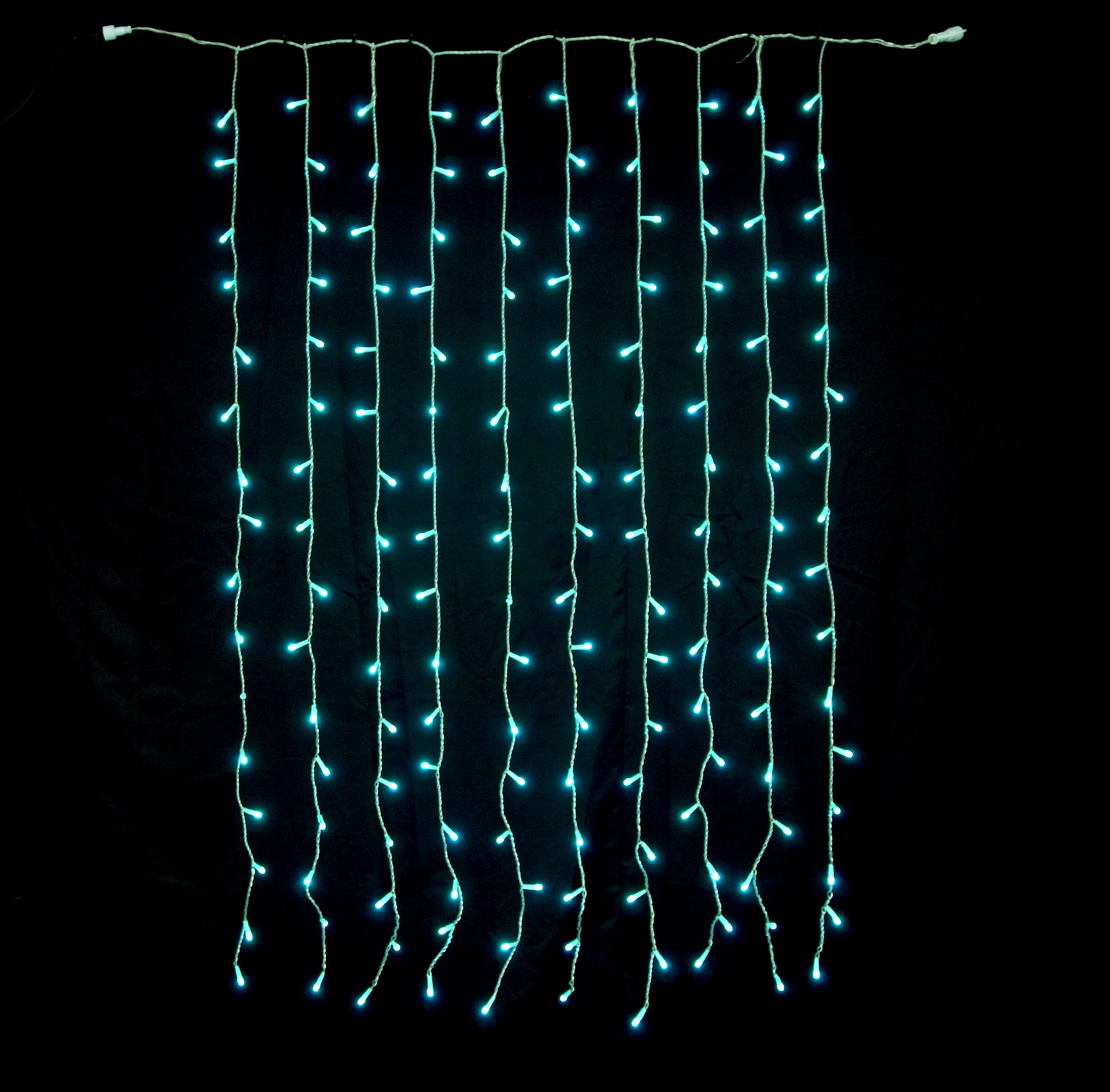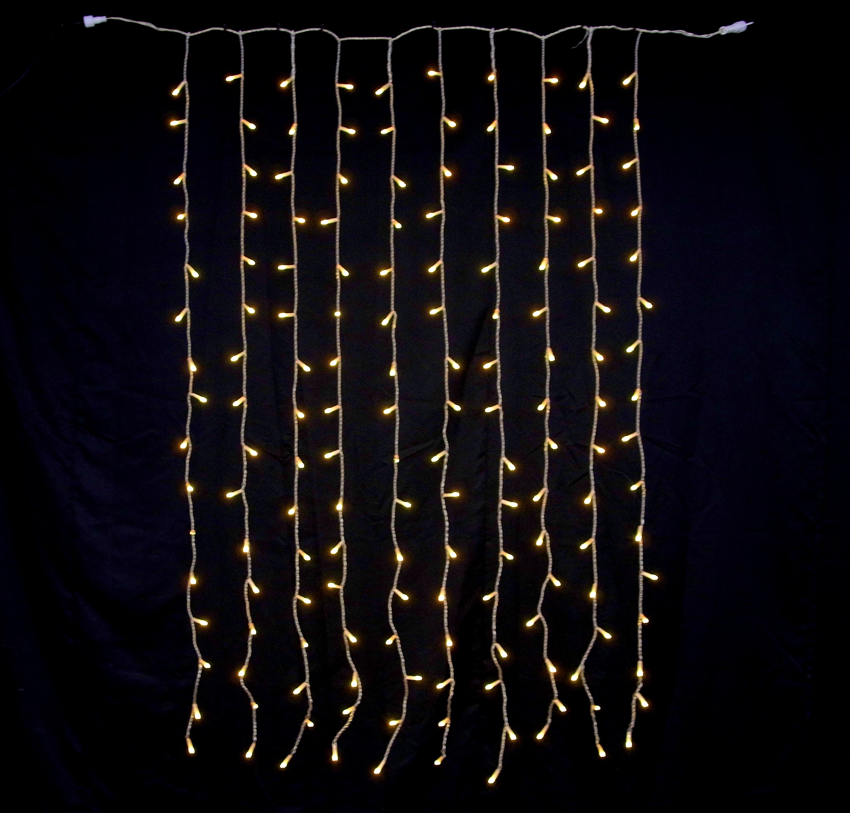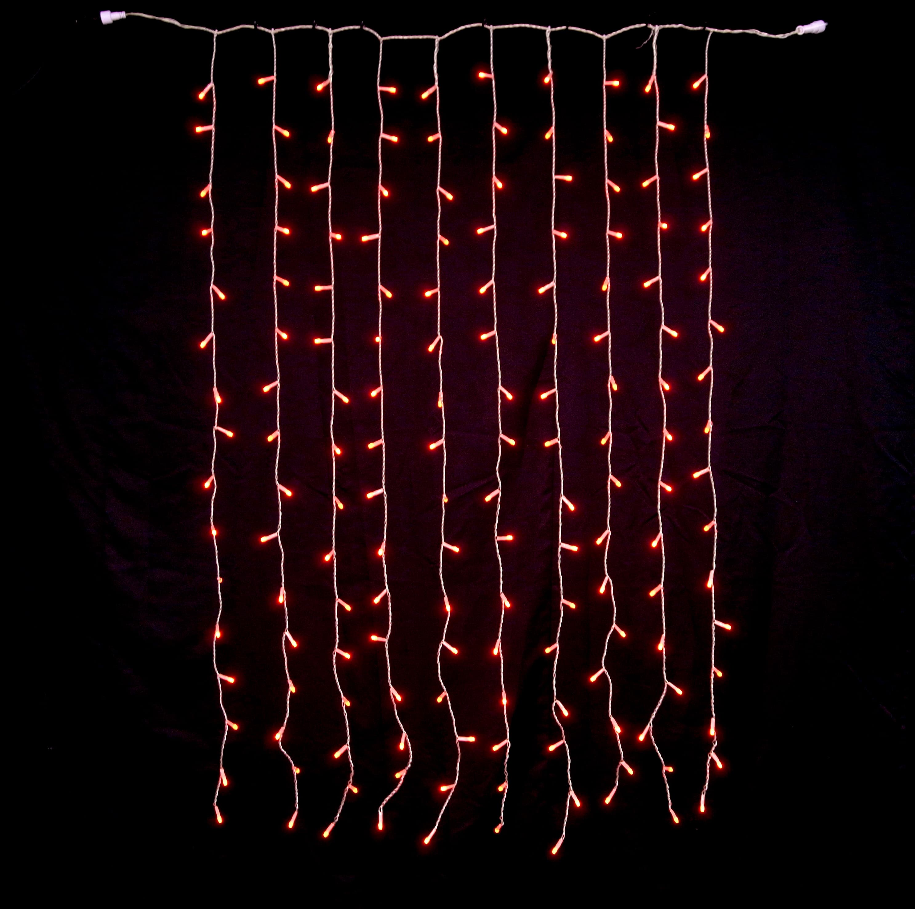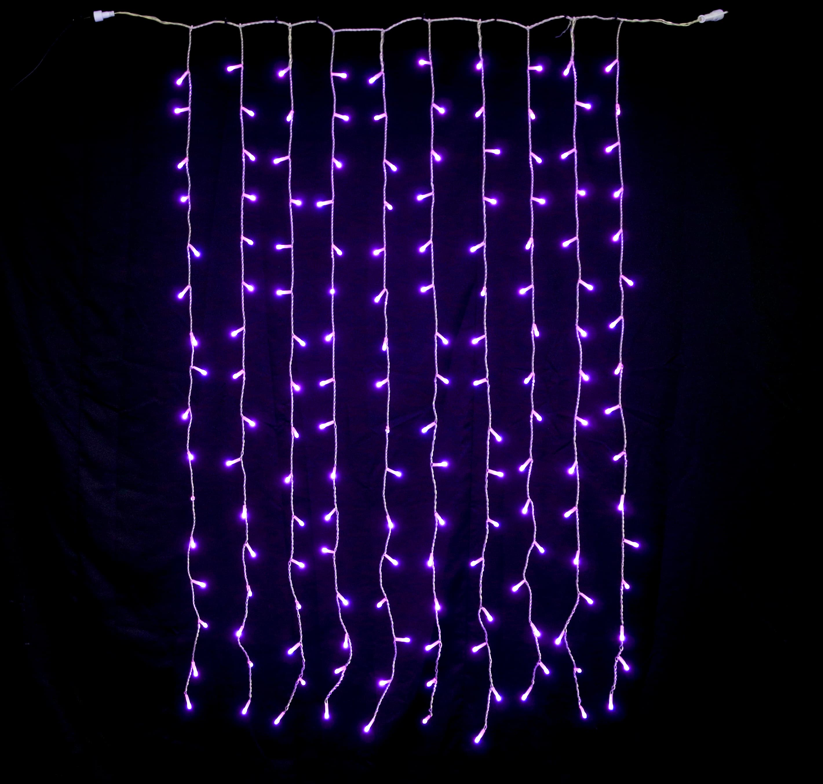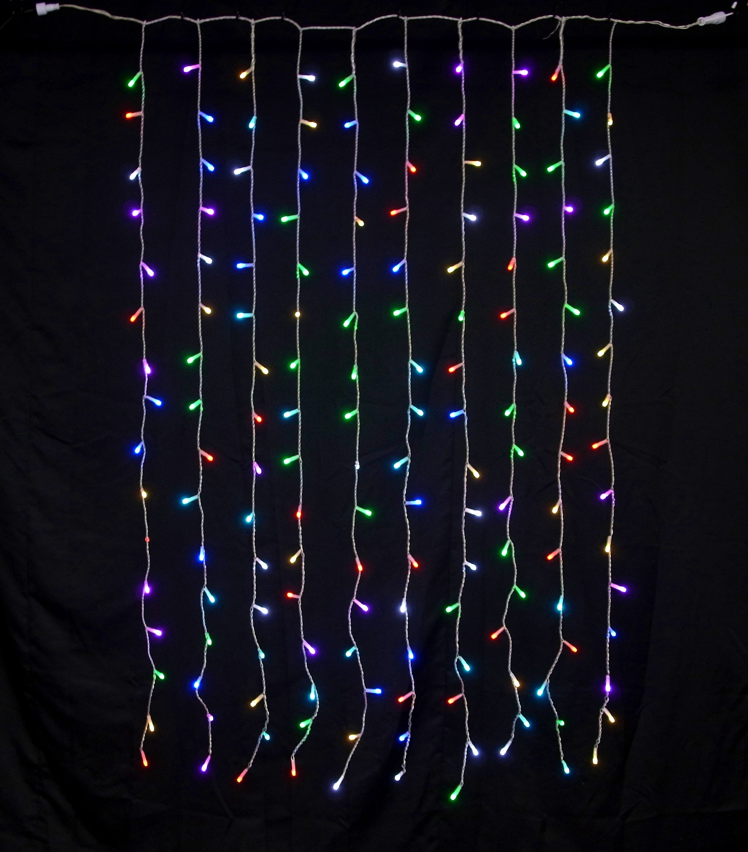 1つのライトで8種類の色と11パターンの点灯が選べる多機能カーテンライト。リモコン操作で自在に色変更可能、メモリー機能付きで設定を記憶。W100cm×H160cmサイズでIPX4防水、最大5連結対応です。