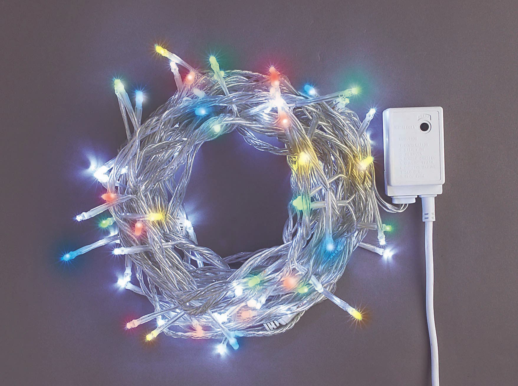カラフルな5色ミックスとシルバーコードの華やかな組み合わせ。太いコードで耐久性に優れ、IPX4防水で屋外も安心。50W連結対応で、イベントやお祭りの大規模装飾にぴったり。明るい建物に馴染む定番ライトです。